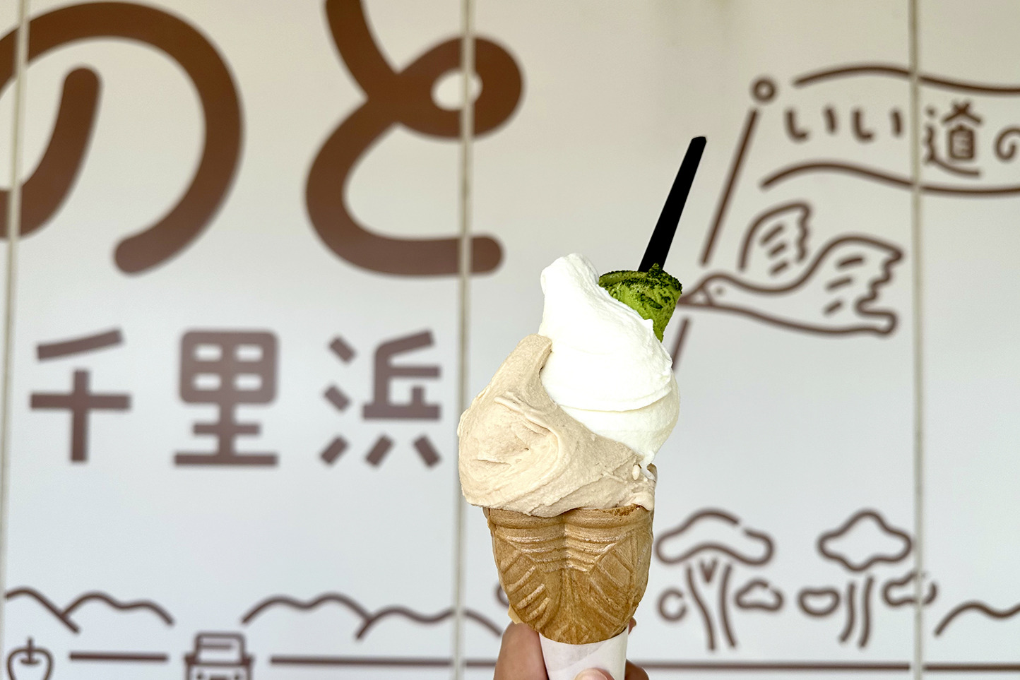 13:00に七尾駅前を出発し、「のと里山海道」を走って1時間ほどの「道の駅 のと千里浜」で休憩しました。