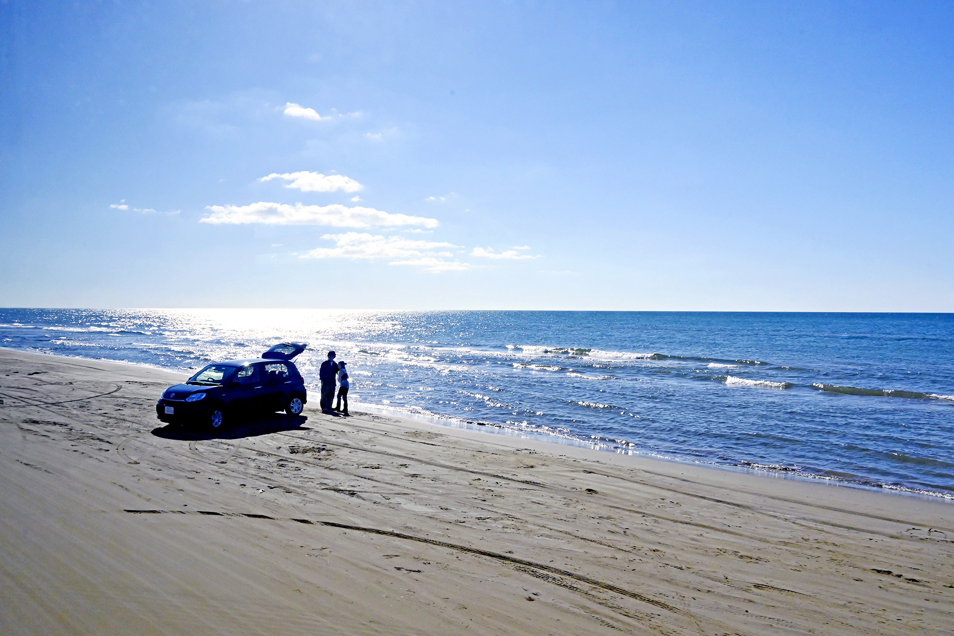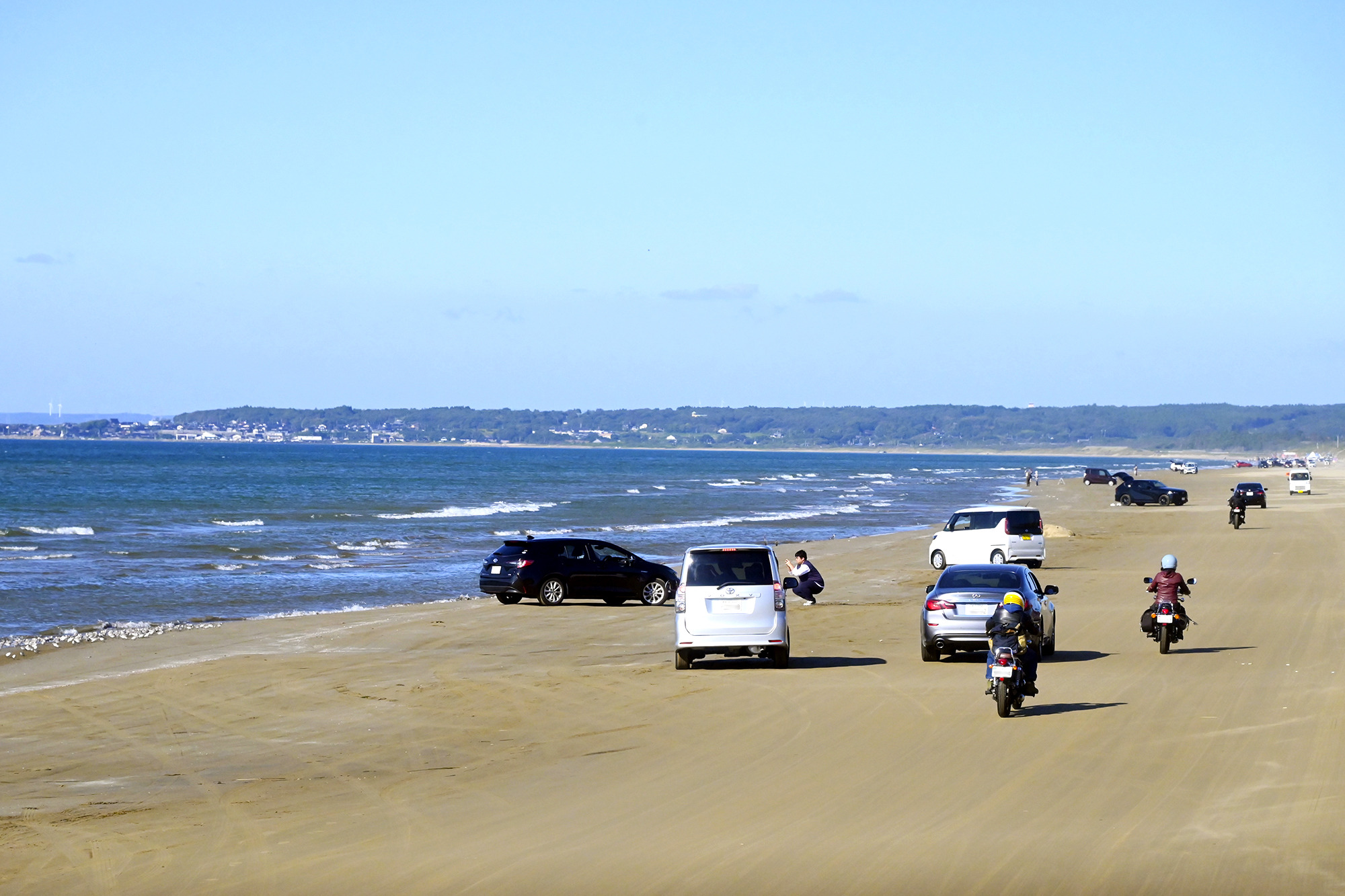 金沢への帰路に「千里浜なぎさドライブウェイ」をバスで走行しました。「千里浜なぎさドライブウェイ」は全長約8kmの日本で唯一の砂浜を走行できる道路で、大型バスや普通自動車、バイクや自転車も走ることができます。