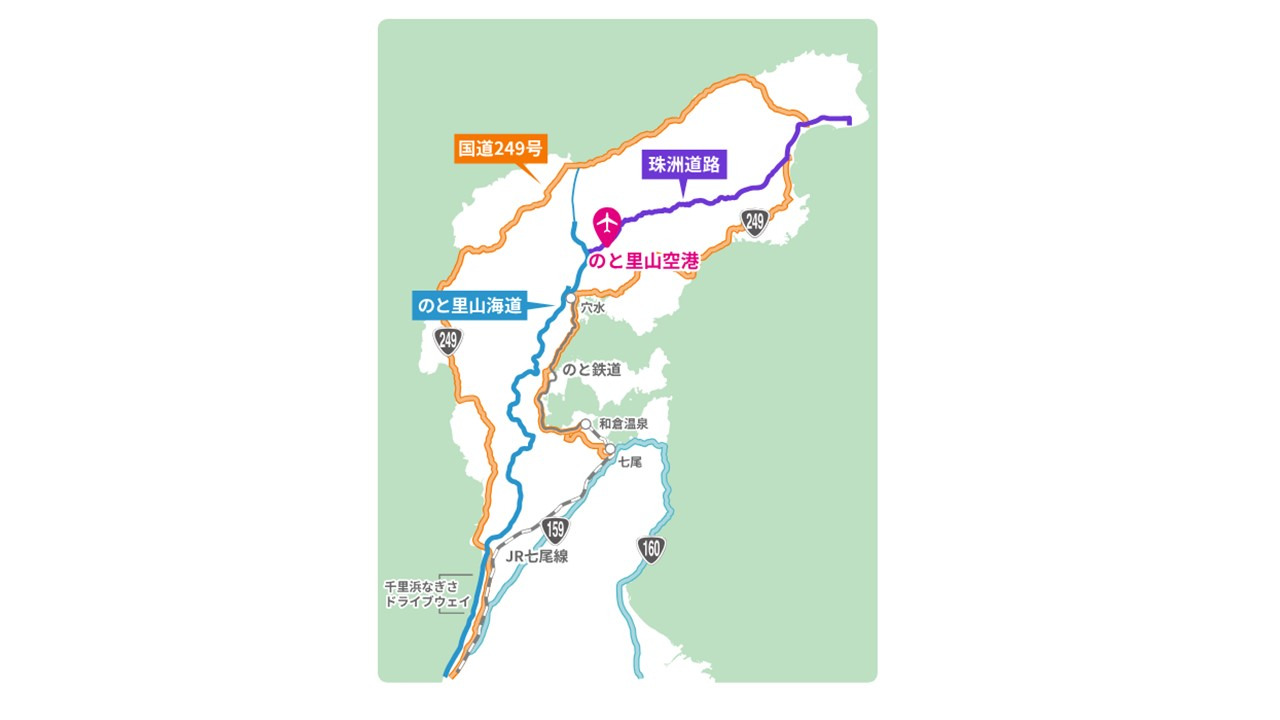 〇主要道路は「国道249号」「のと里山海道」「珠洲道路」の3つです。