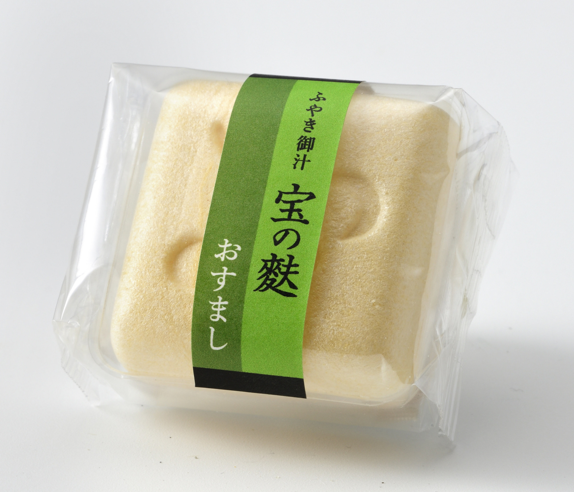 加賀麩不室屋のふやき御汁 宝の麩は、金沢ならではの美味しさと遊び心を凝縮した彩り豊かなお吸いものです。発売から三十年以上を数えるこの商品は、五代目当主の妻が子どもたちを思う心から生まれました。留学中の子どもたちが日本の味を手軽に楽しめるようにと、麸や乾燥野菜を詰めたふやきのお吸いものを送ったことがきっかけです。その後、海外に住む日本人からも高評価を受け、商品化されました。お湯を注ぐと、飛び出す具の美味しさと楽しさが広がり、従来の即席お吸いものにはなかった新しい体験を提供しています。