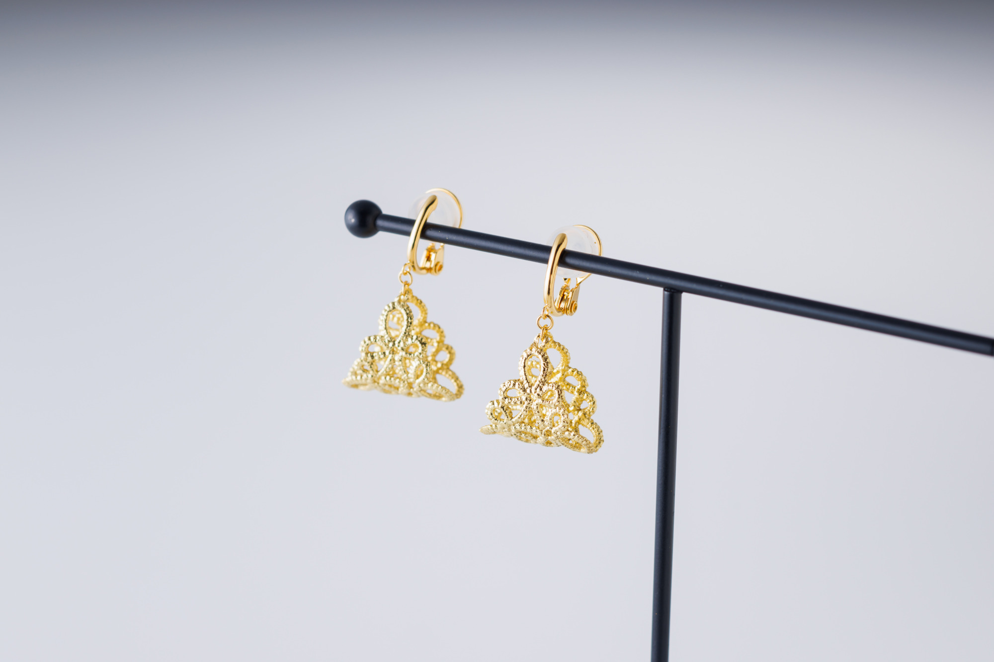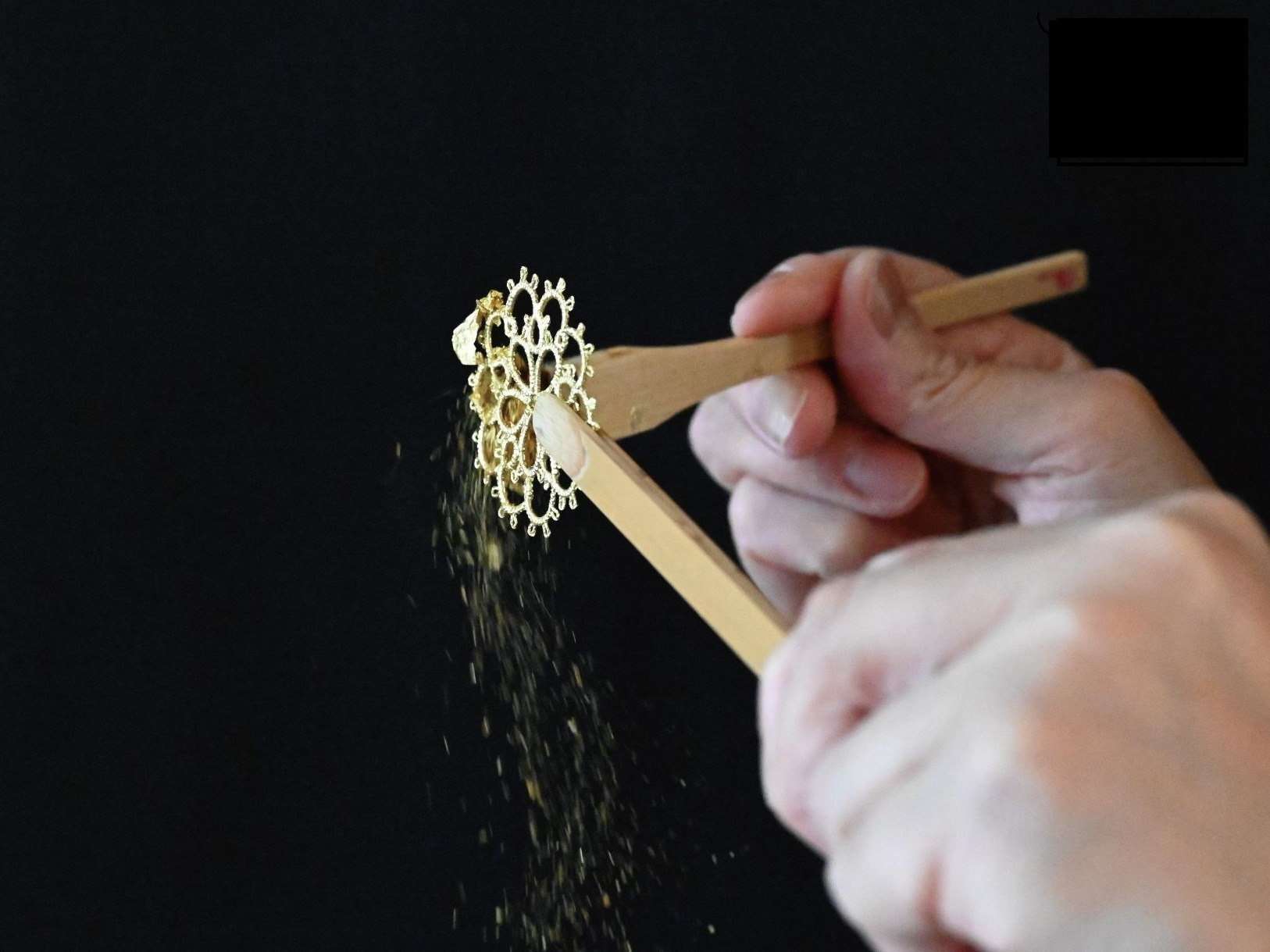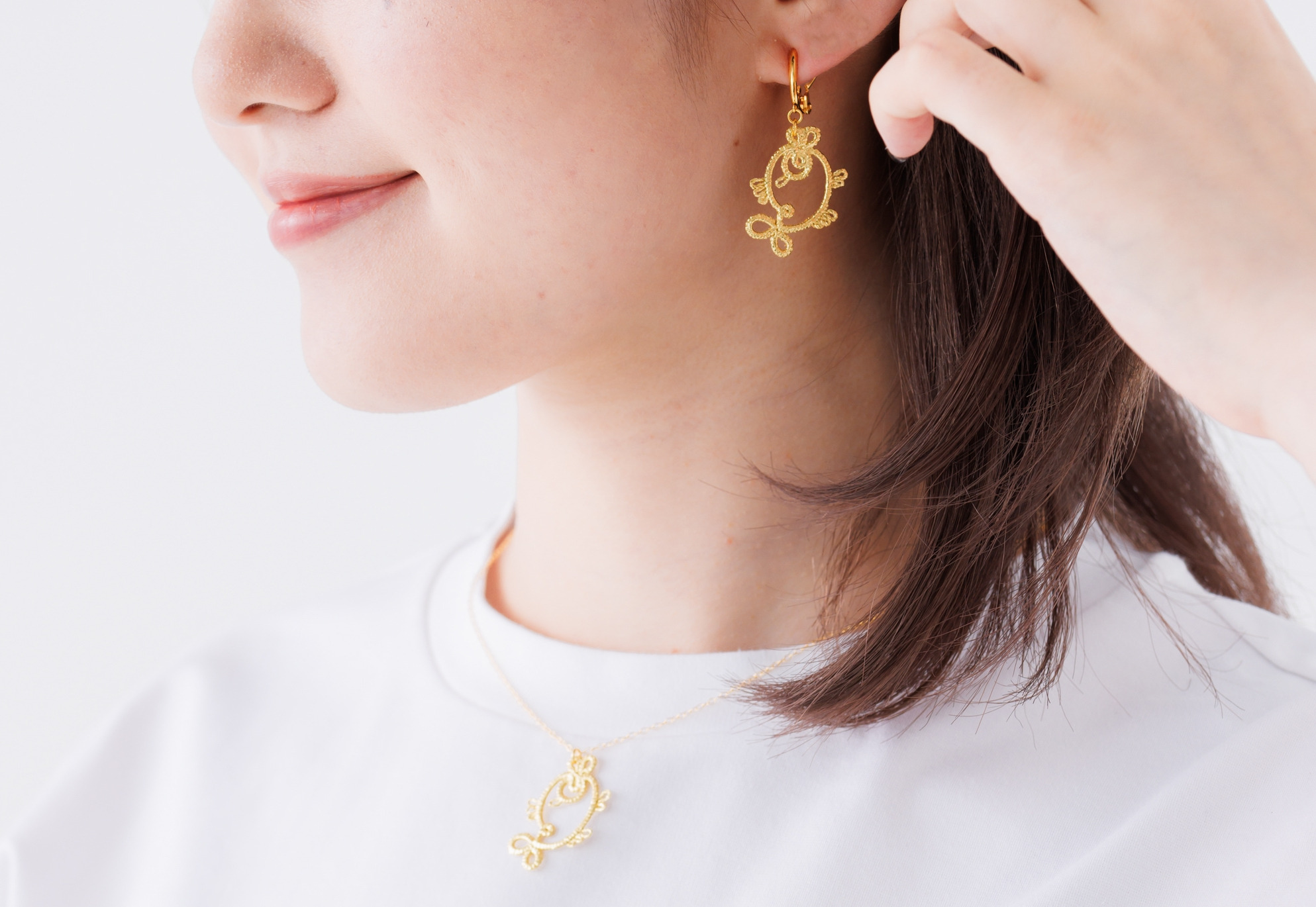 - 国指定伝統的工芸品の金沢箔を、石川県産の絹糸で編んだレースに貼り付けた、繊細で軽量なアクセサリーは、まさに唯一無二の存在です。この新しい形の伝統工芸は、金沢の伝統技術を現代に生かした美しい作品で、軽やかさと華やかさを兼ね備えています。金箔ジュエリーGold-Knotは、古き良き伝統を守りつつ、日常使いできるスタイリッシュなアクセサリーとして、世界中で高く評価されています。