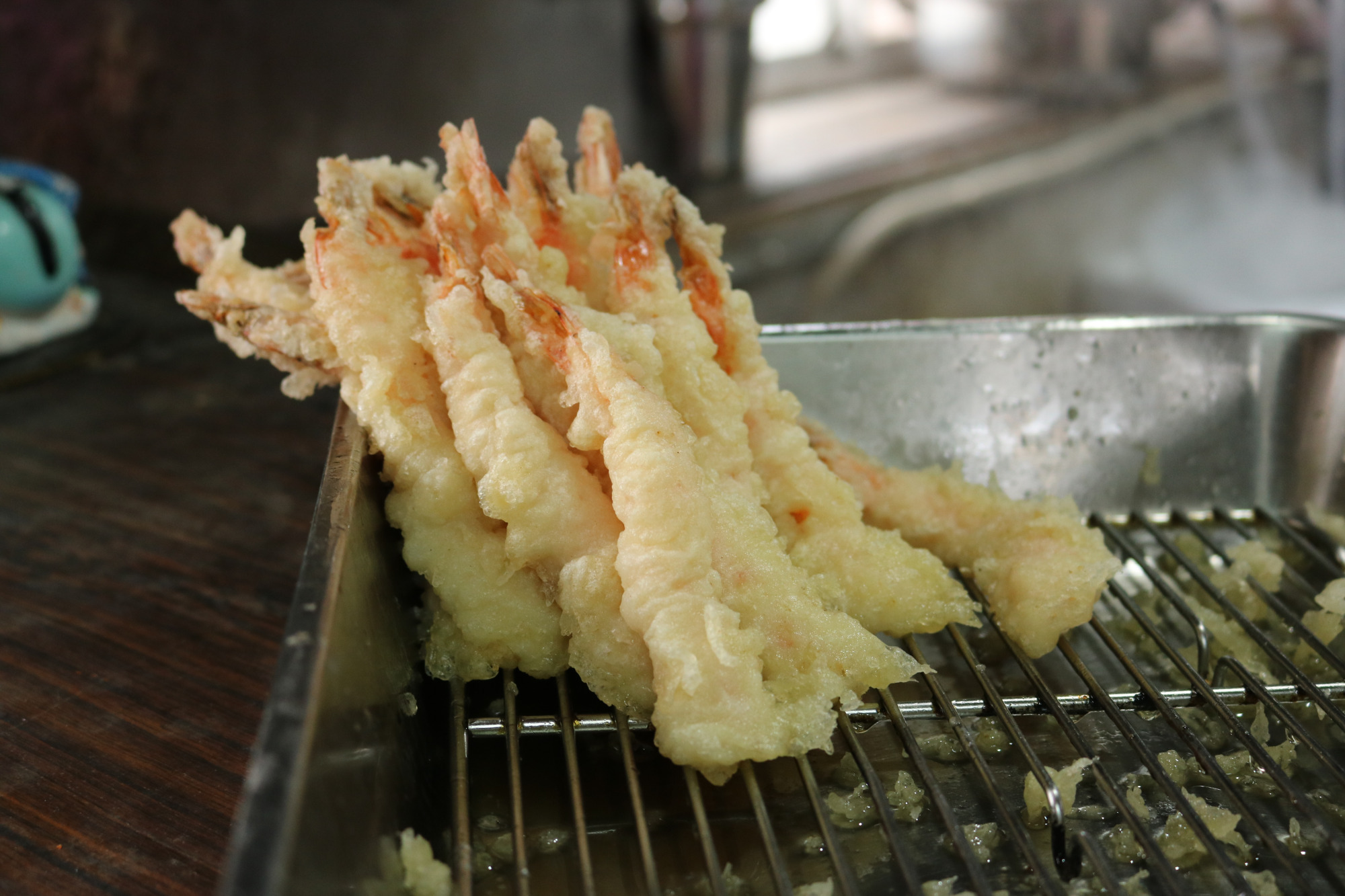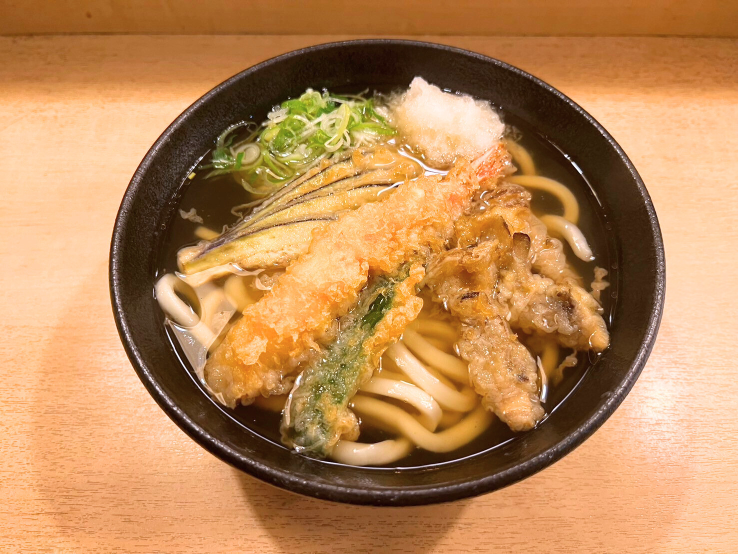 大きな海老天に、季節の野菜の天ぷら3種が入った人気の一杯です。この日は舞茸、ピーマン、茄子がトッピングされていました。さらに、大根おろしが添えられているため、途中でダシに溶かすと、さっぱりとした味わいに変化します。