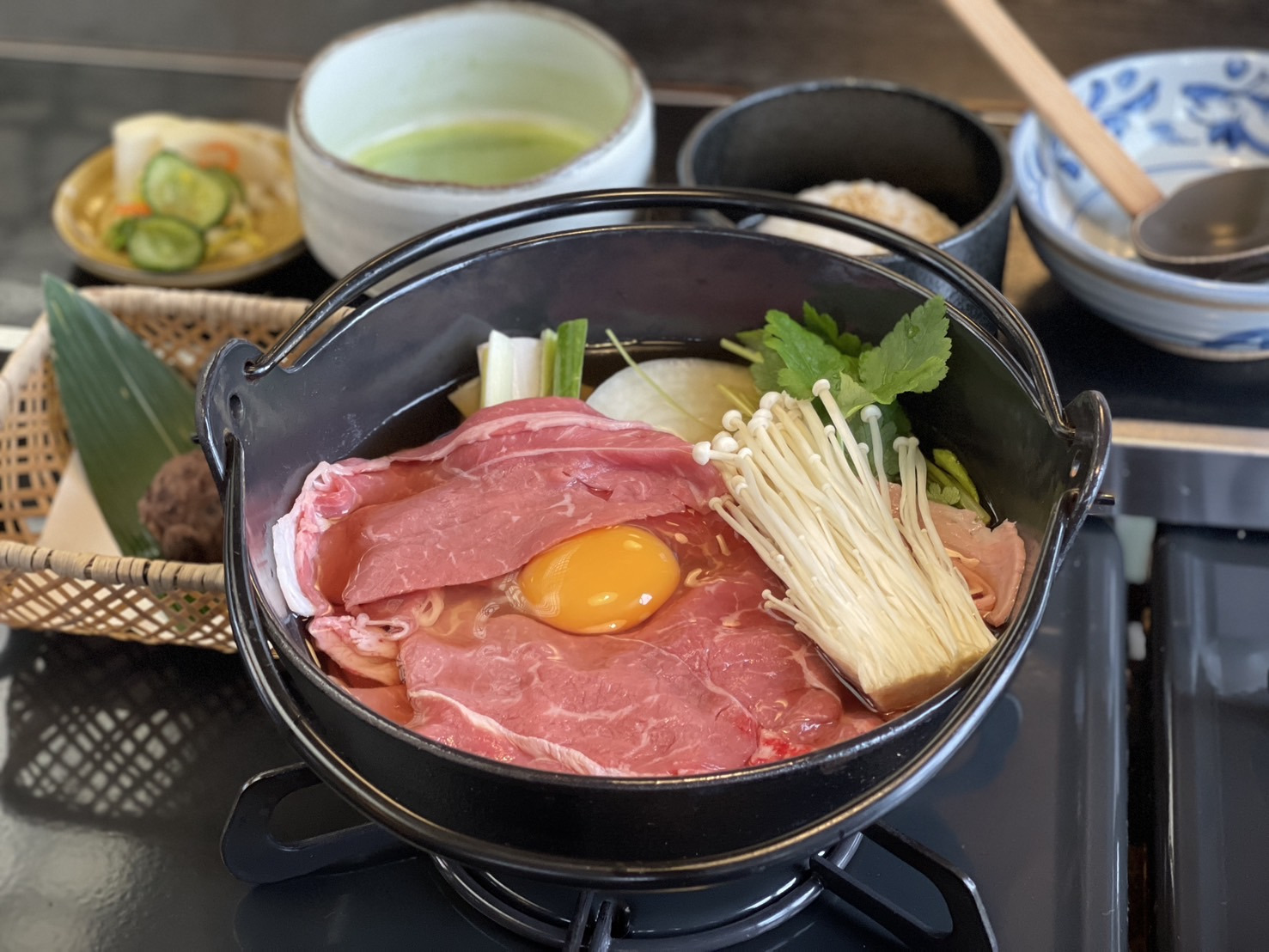 うどんが見えないほど大きな牛肉が入ったこのうどん鍋は、年間を通して楽しめる人気メニュー。うどんのダシと牛肉の旨みが絶妙に絡み合い、シンプルながらも深い味わいを堪能できる一品です。