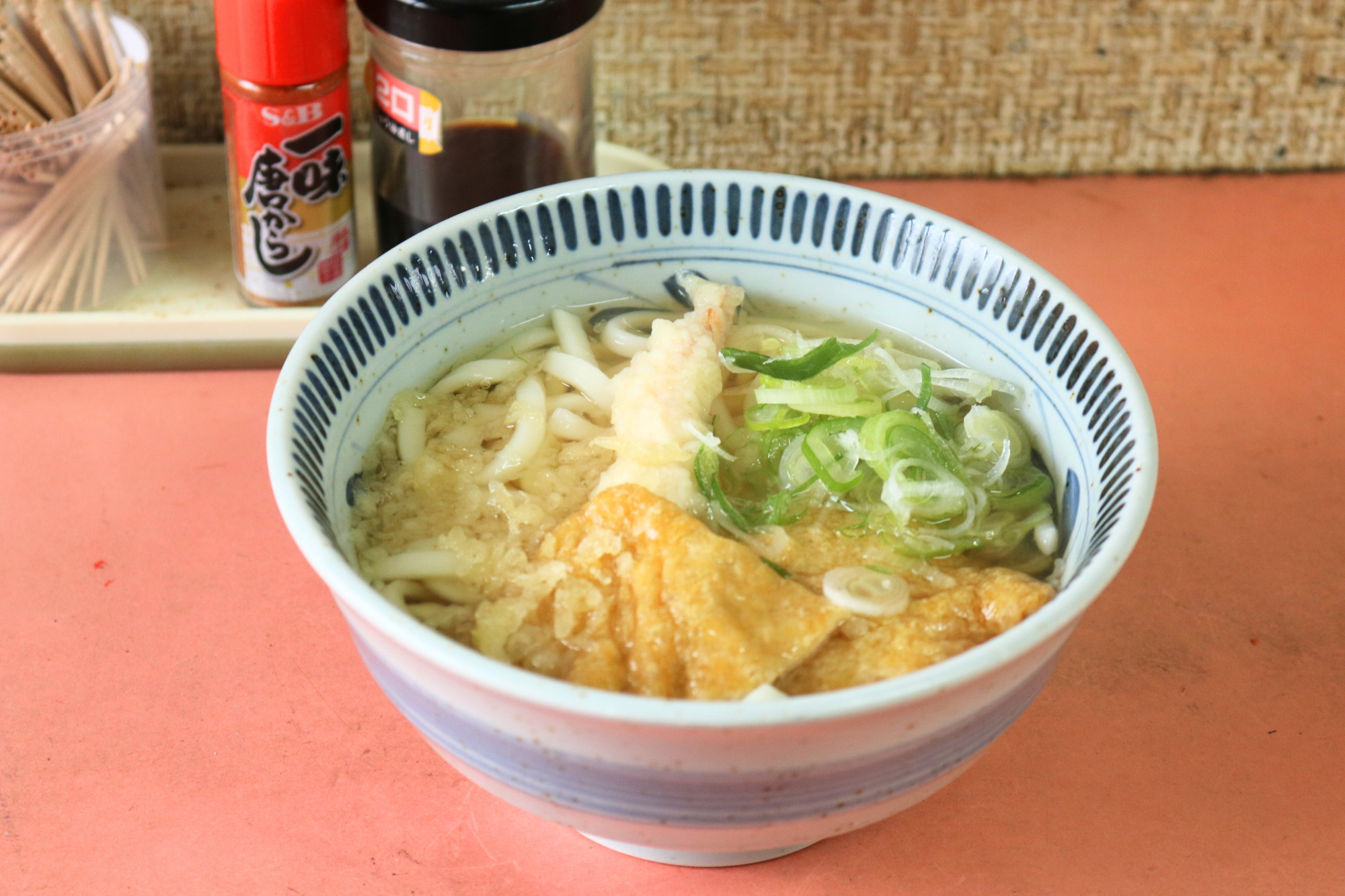 同店の看板メニューは、「天ぷらいなりうどん(360円)」。手づくりの天ぷらと甘めのいなりがのったうどんで、最初は関西風のあっさりとしたダシが楽しめますが、食べ進めていくうちにいなりの甘みがダシに溶け込んで、味わいが変化し、さらに美味しくいただけます。