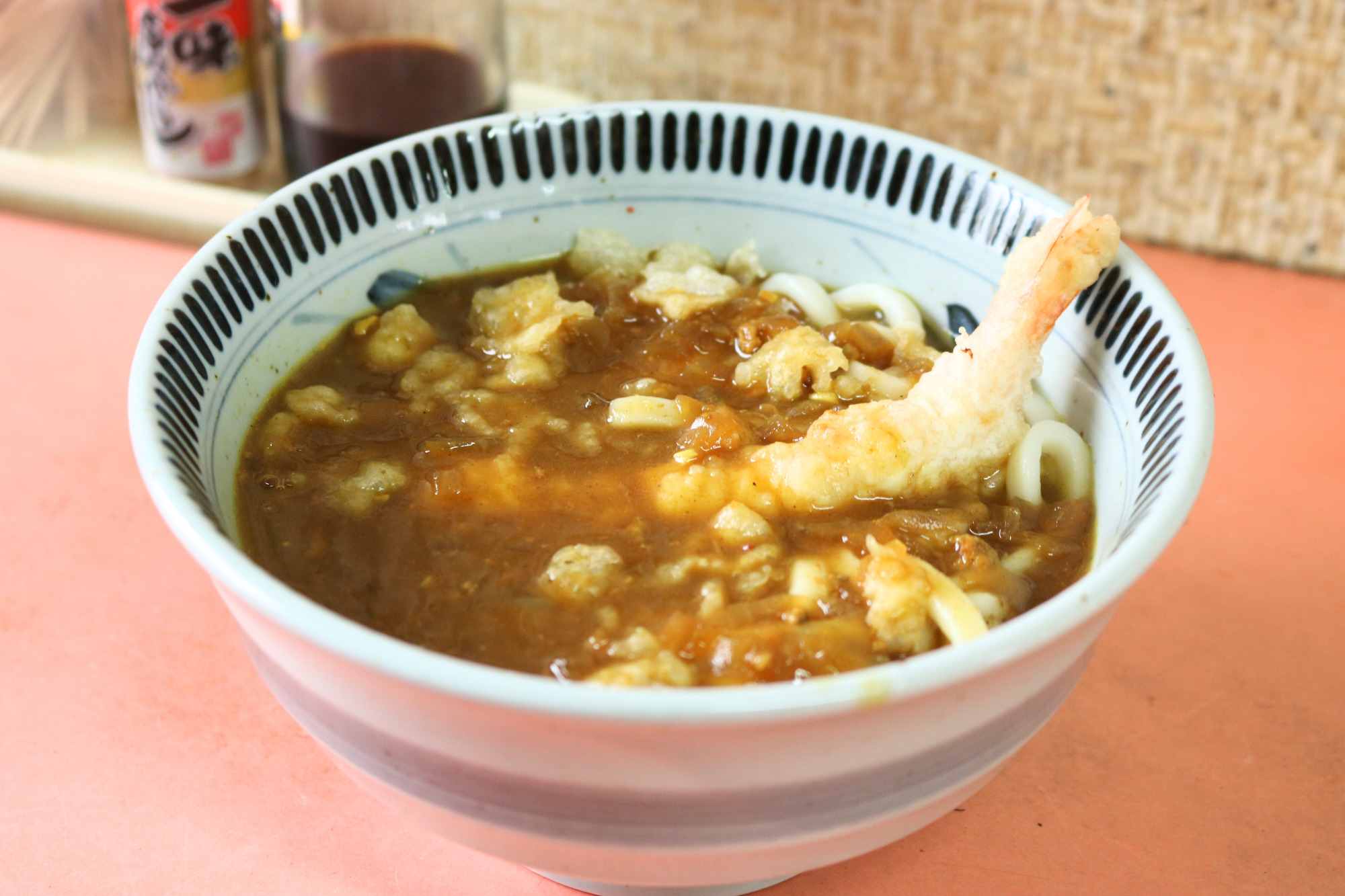 また、もう一つの人気メニューは「カレー天ぷらうどん(420円)」です。自家製のカレーとダシが絶妙にマッチし、定番人気の逸品として長年愛されています。