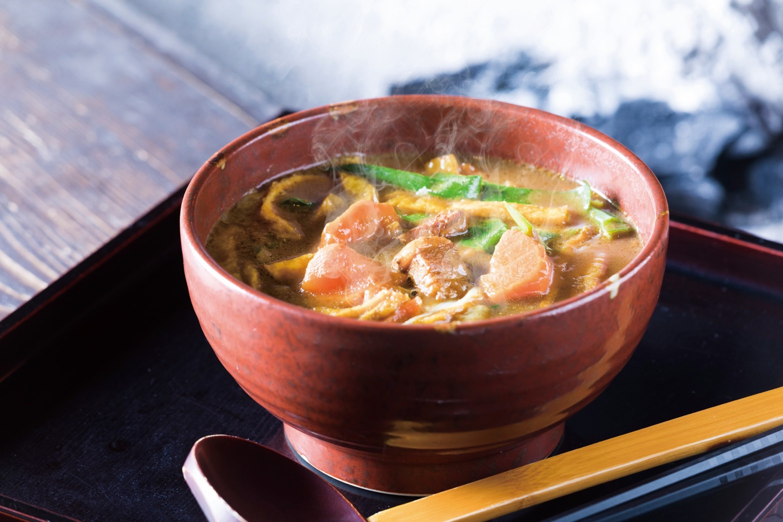 長ネギ、人参、油揚げが入っており、お多福自慢の出汁とカレーが絶妙に絡み合う一杯です。コク深い味わいと、ほどよいとろみが特徴で、最後の一口まで楽しめます。