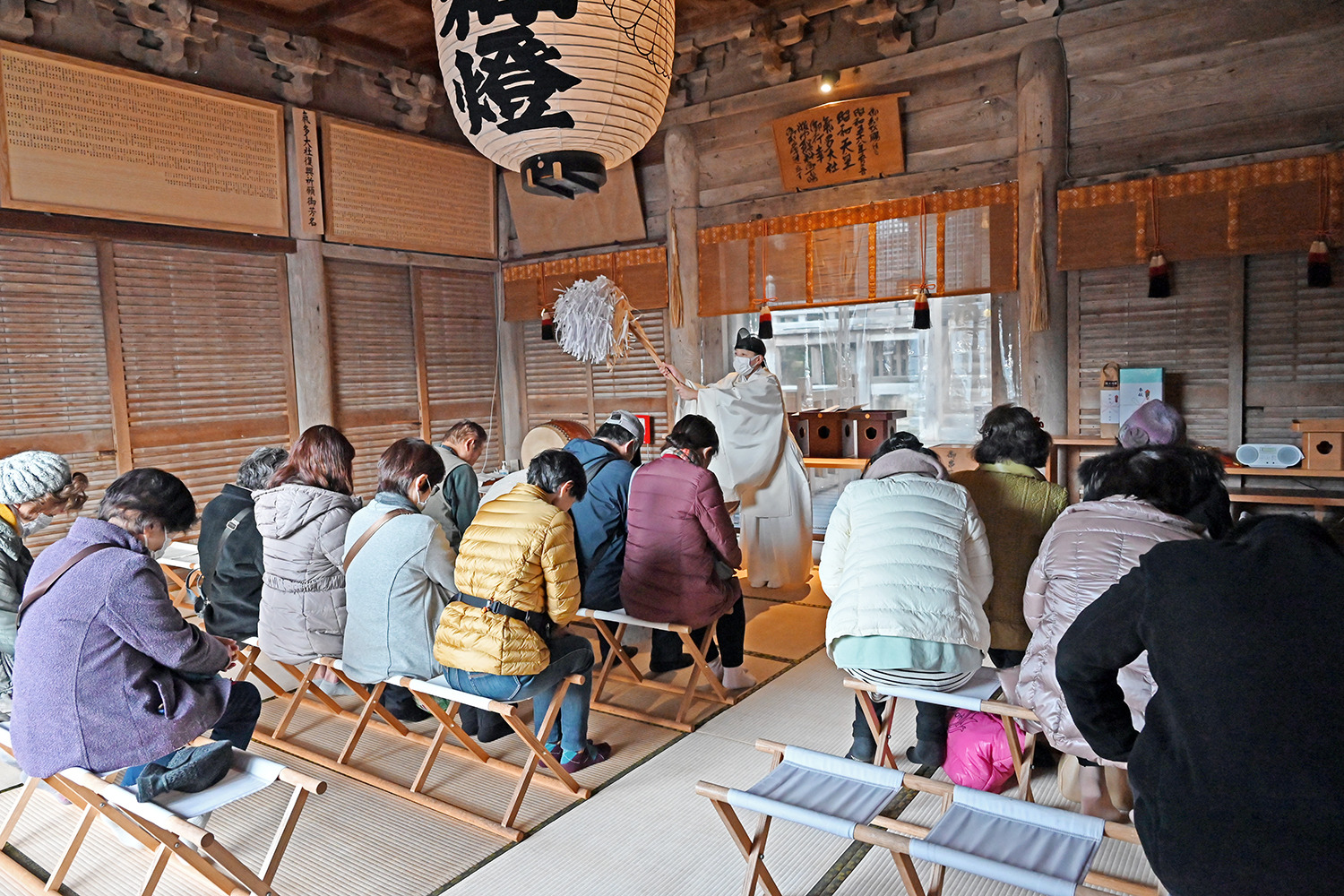 手水舎で手を清め、国指定重要文化財の神門の前で記念写真を撮影し、神門の中へと進み、拝殿での昇殿参拝を行いました。神主の祝詞奏上とお祓いに次いで、参加者の代表が前に進み出て全員で能登の復興を祈願しました。