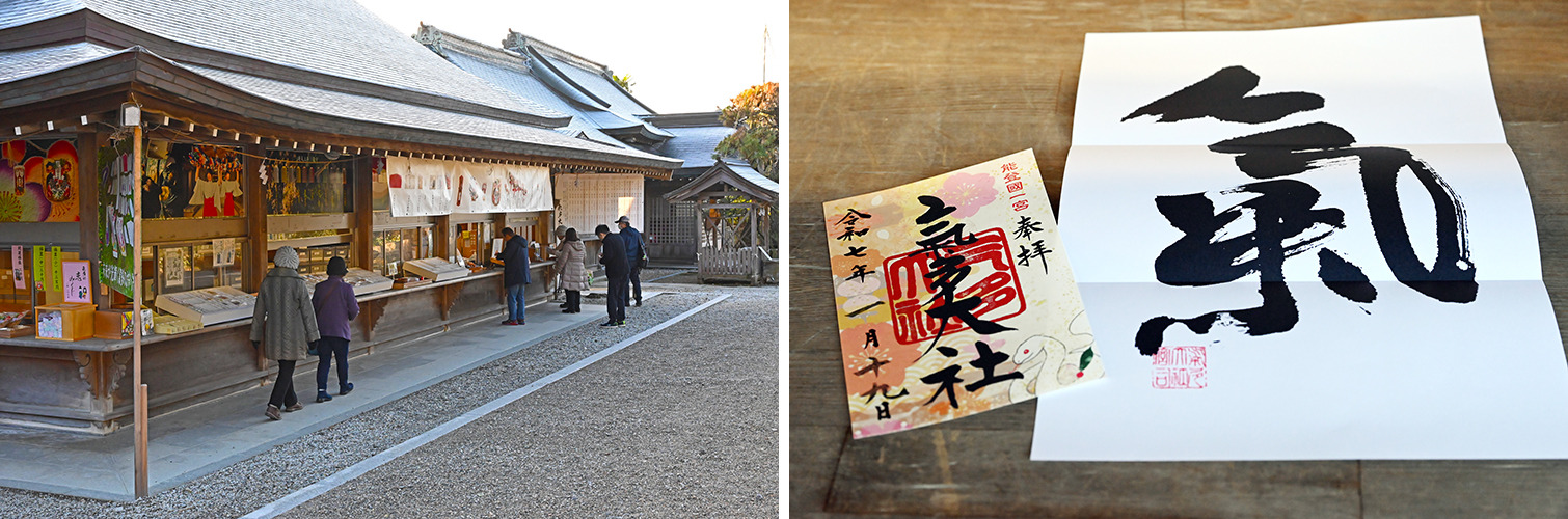 参拝記念に「氣」と書かれた縁起物をいただき、参加者の皆さんは境内の授与所で御朱印やお守りなどを買い求め、手にされていました。
