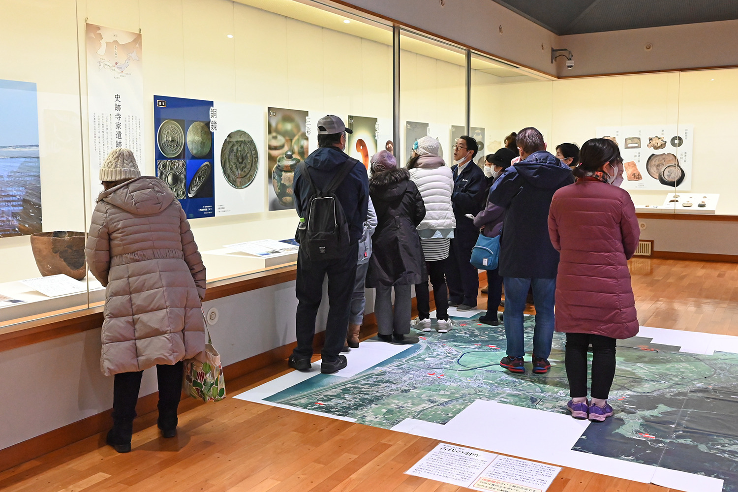 館長の牧山直樹さんの案内で、2階の企画展を解説付きで鑑賞しました。羽咋市は、北陸屈指の弥生遺跡で国指定史跡の「吉崎・次場(すば)遺跡」「寺家遺跡」をはじめ、縄文時代から中・近世にかけての遺跡を多数有する土地で、今回の企画展では「氣多大社」に関する古文書や、渚の正倉院と称される「寺家(じけ)遺跡」から出土した氣多大神宮(氣多大社)の宝物、勾玉や銅鏡など約100点の貴重な品が過去最大規模で特別公開されています。