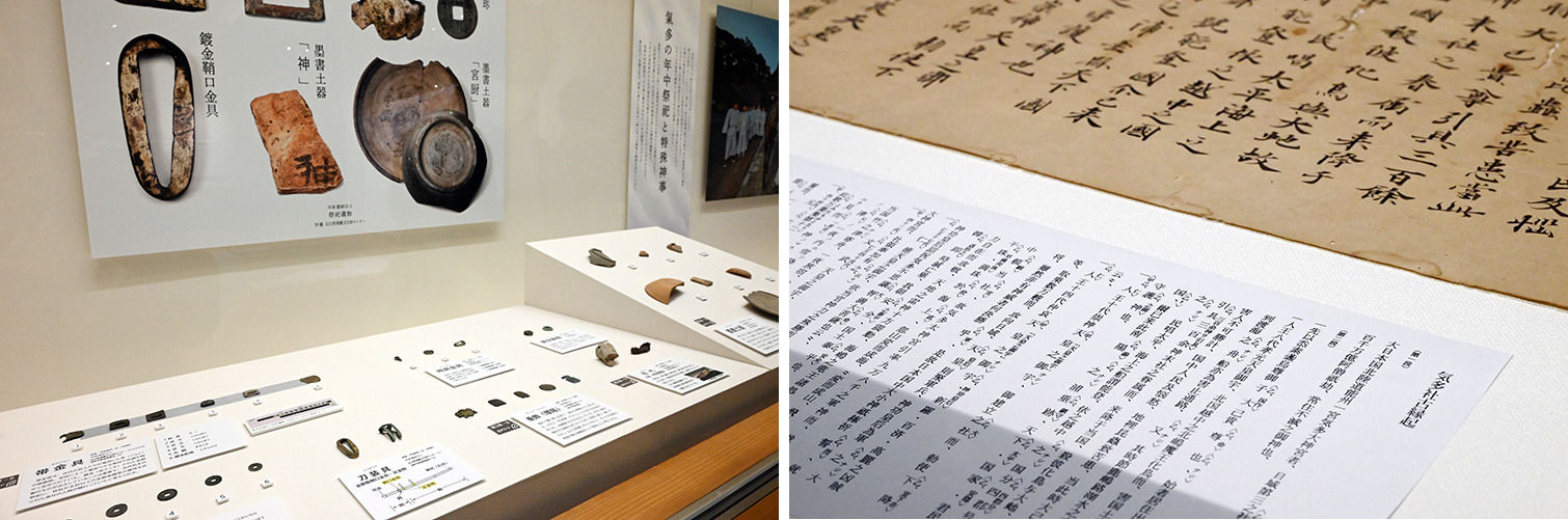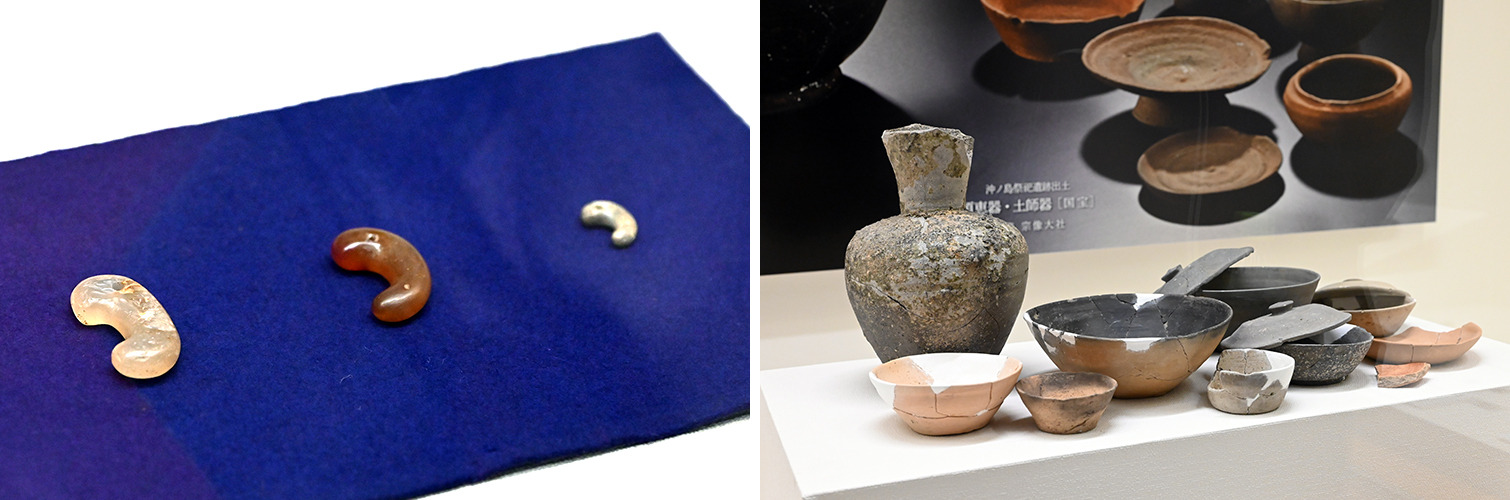 「海の正倉院」といわれる福岡県沖ノ島の宗像大社の祭祀遺物(国宝)の写真と、「渚の正倉院」といわれる氣多大社の祭祀遺跡「寺家遺跡」から出土した祭祀遺物の実物・写真が比較展示されています。貴重な品々は見応えがあり、改めて氣多大社の歴史の深さと存在の大きさを実感させられました。