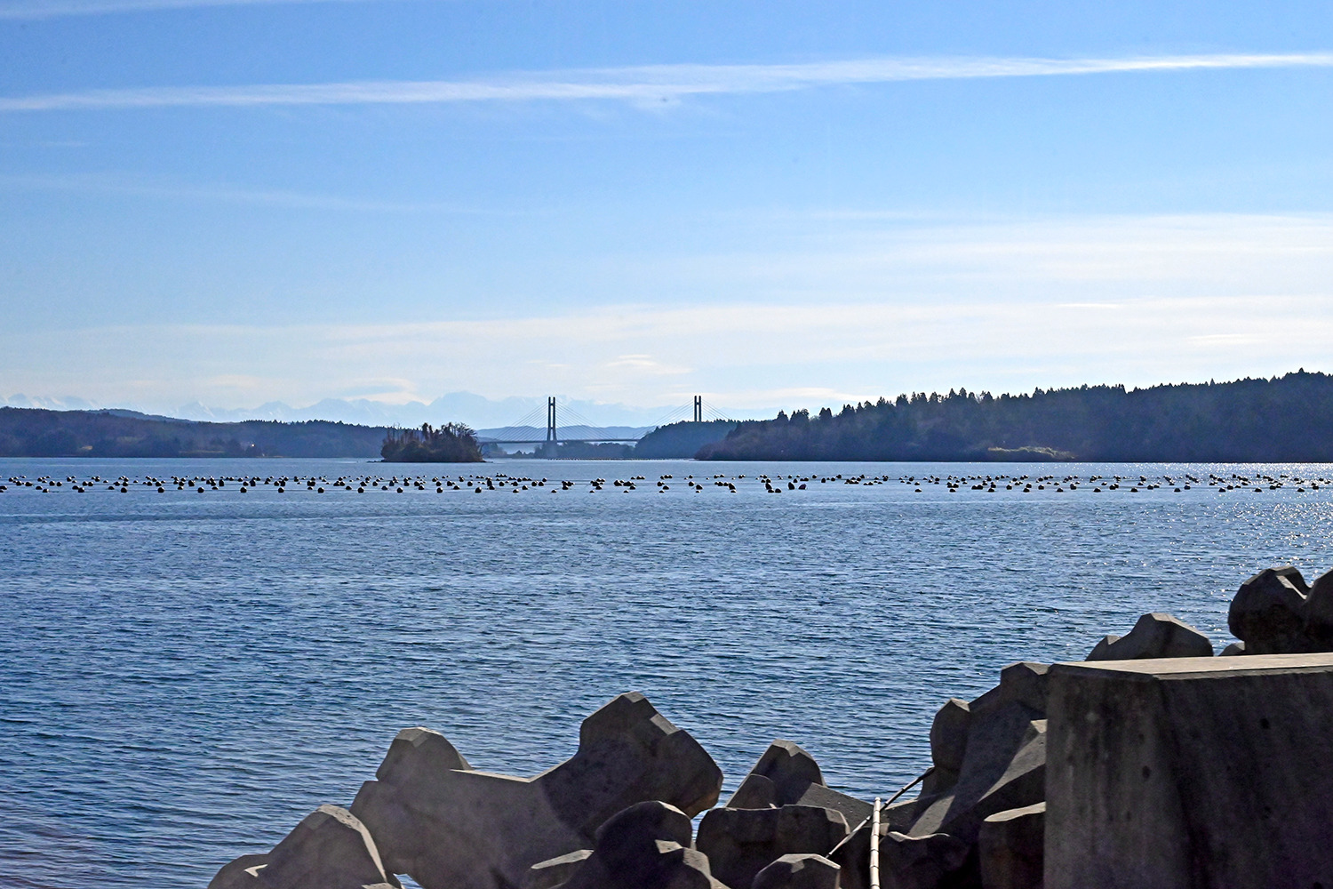この日は好天に恵まれ、国道249号の海沿いルートを通過していると穏やかな七尾湾と冠雪した立山連峰も見ることができました。震災で通行止めになっている能登島に架かる「ツインブリッジのと」もよく見えました。