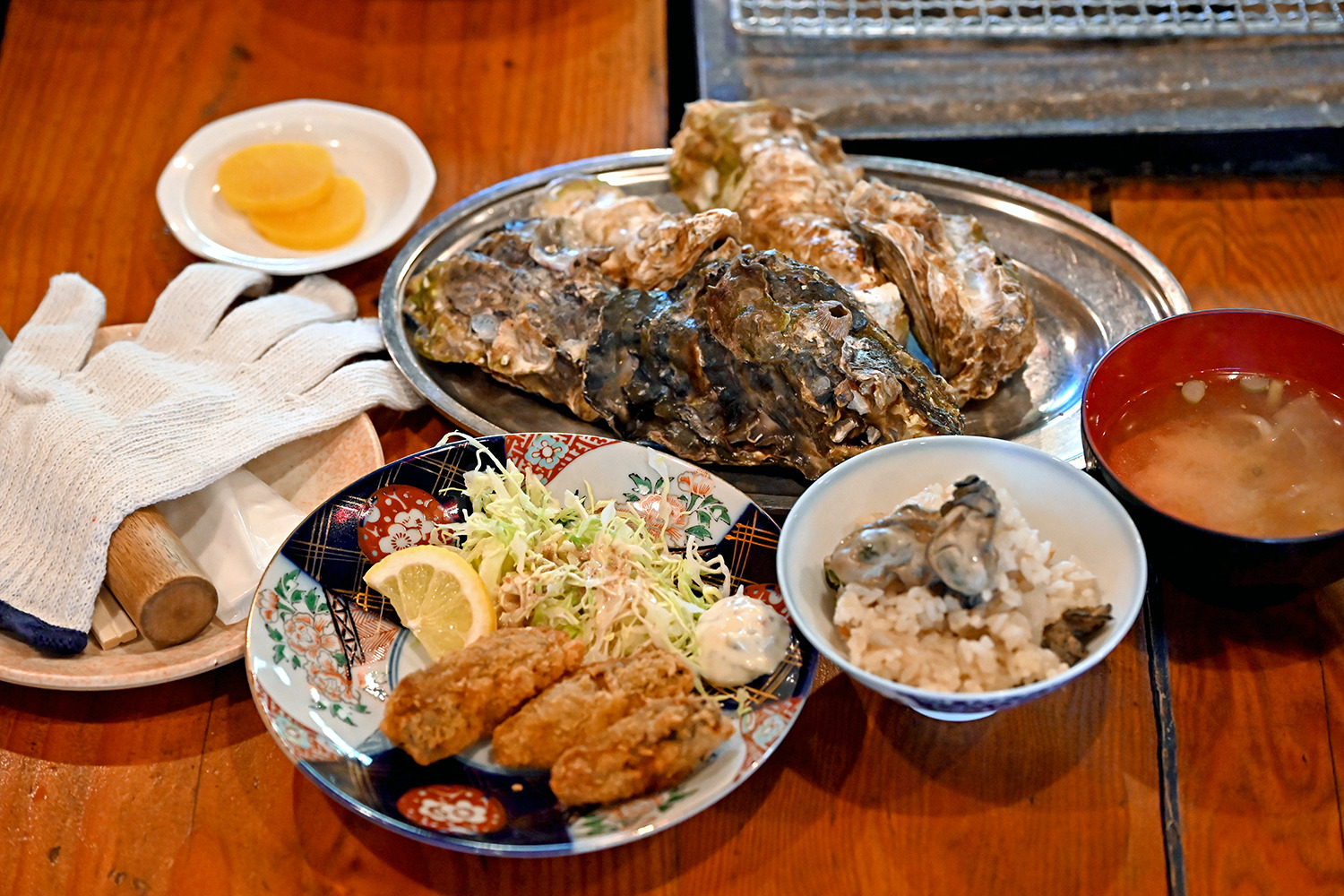 店内に入ると炉端では炭が赤々と燃え、着席すると炭火焼き用のカキ5個、カキフライ3個、カキ飯とお味噌汁、漬物が次々と運ばれてきました。店員さんから「まずは2分ほどカキの平たい面を焼き、ひっくり返して反対側を5、6分焼いてください」という説明を聞いて、参加者の皆さんは次々と網の上にカキを並べて焼き始めました。