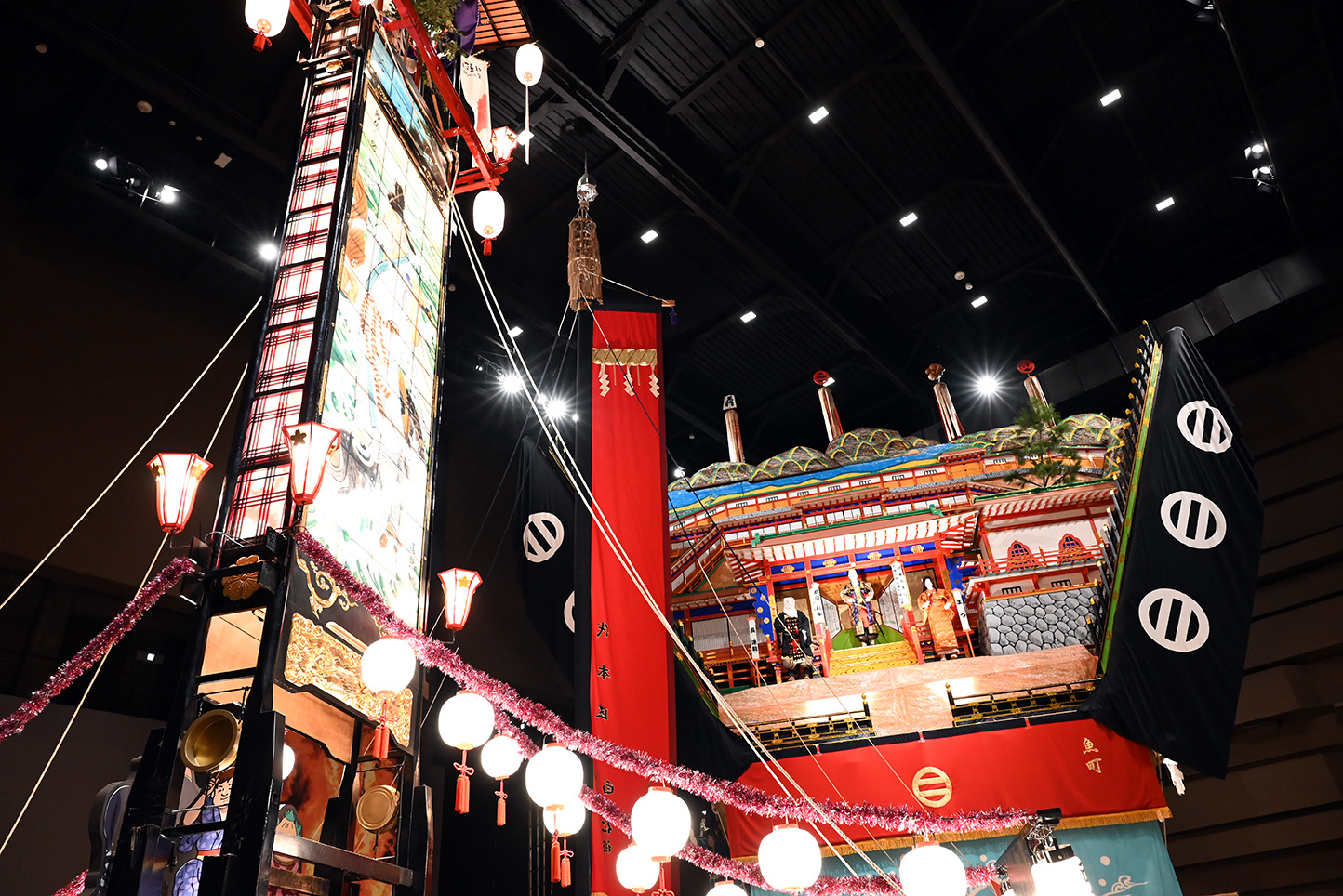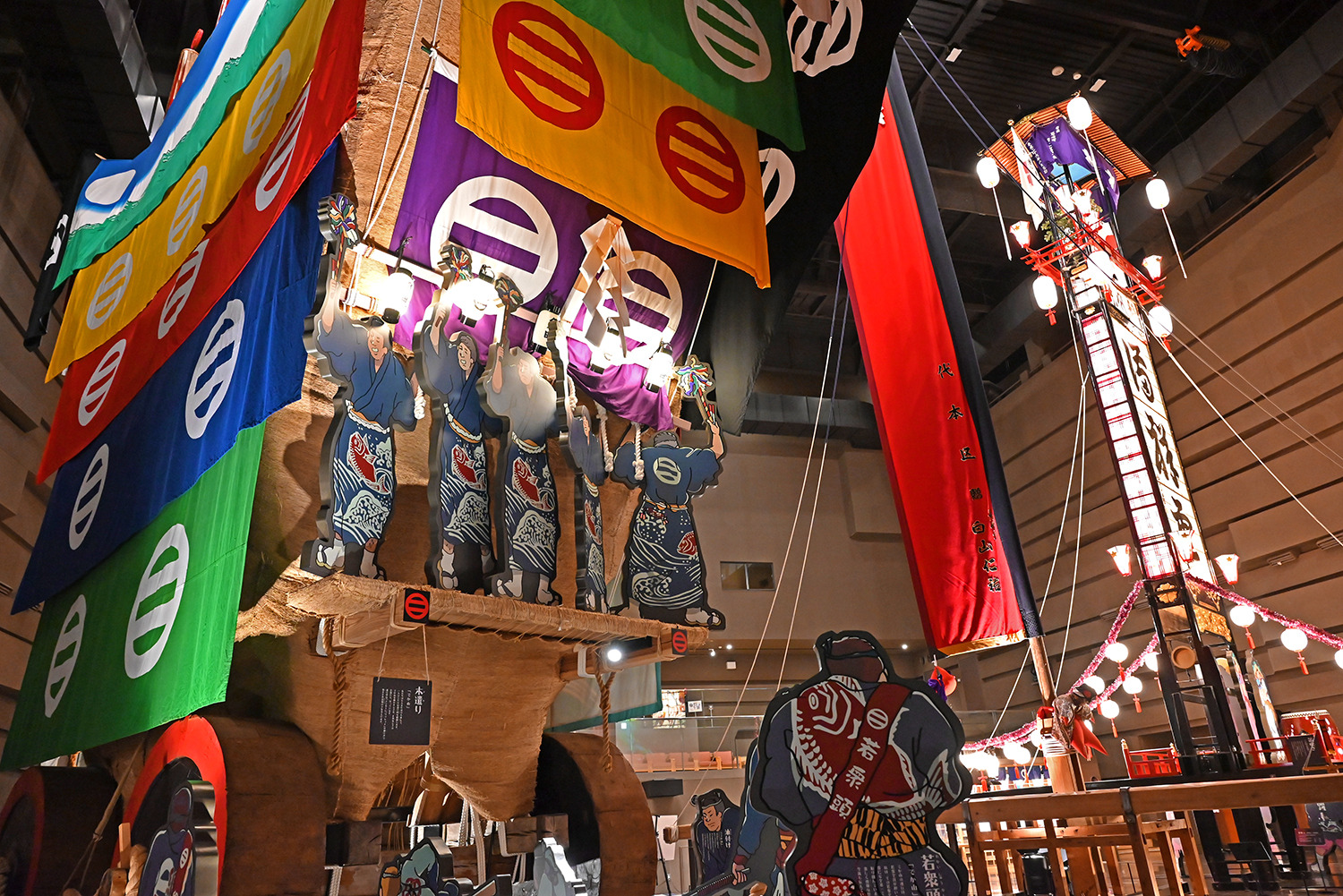 展示室に入ると、そこには天井高17mもある圧巻の空間が広がり、七尾市を代表する4つの祭り「青柏祭(せいはくさい/青柏祭の曳山行事)」「能登島向田の火祭」「石崎奉燈祭」「お熊甲祭(おくまかぶとまつり/熊甲二十日祭の枠旗行事)」の展示が迫力満点に迫ってきました。