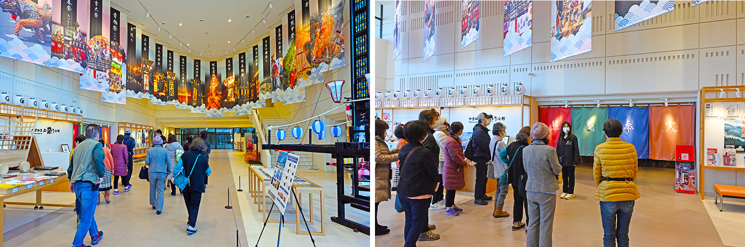 館内に入るとエントランスには能登を代表する数々の祭りを紹介するバナー(垂れ幕)がずらり。ここでスタッフの中村友紀さんから震災から約1年を経た「和倉温泉お祭り会館」の状況などを聞き、展示室へと入りました。