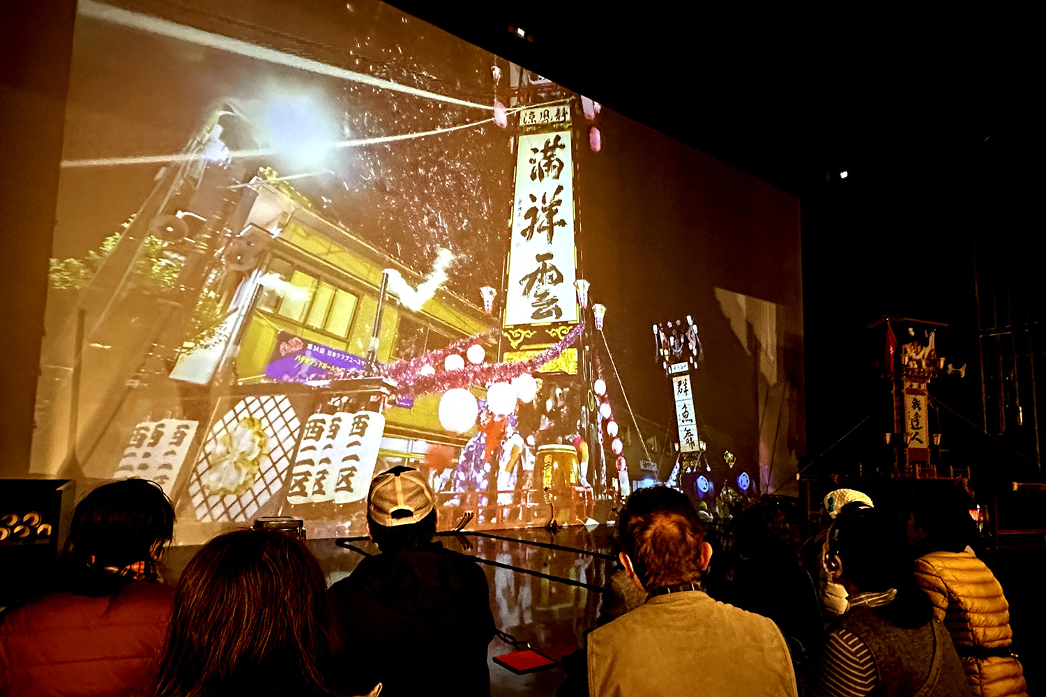 まず最初に巨大スクリーンに映し出される七尾市の四大祭りの映像を鑑賞。音と臨場感あふれる演出で、祭りの雰囲気を疑似体験することができます。映像で各祭りの特徴をつかんだら、次は祭りで使われていた高さ12〜16mもある曳山、奉燈(キリコ)、枠旗の実物展示、高さ15mのバナー(垂れ幕)で再現された柱松明の火柱などを間近で見ながら解説を聞きました。
