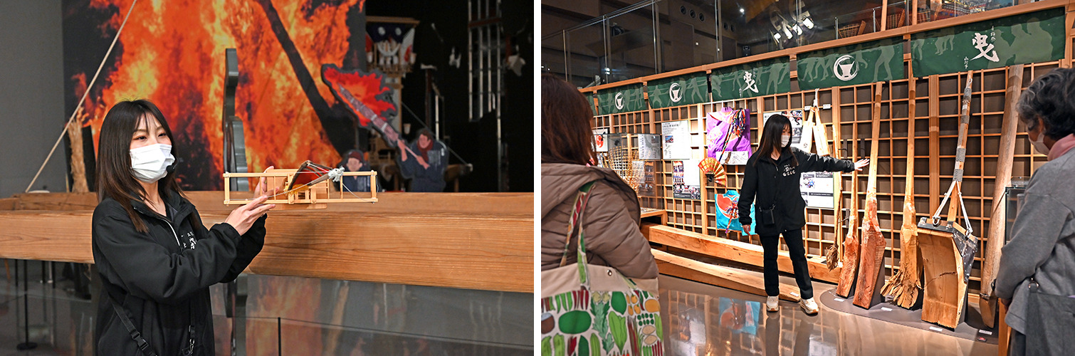案内してくれた中村友紀さんは、「でか山に出たくて大学卒業後は地元に戻ってきた」というほど大のお祭り好き。ユネスコ無形文化遺産に登録された青柏祭の「でか山」の辻廻し(方向転換)の方法と道具についてや、「お熊甲祭」の妙技「島田くずし」の名前の由来など、祭りの魅力と見どころなどを詳しく紹介してくれました。次はぜひ本物のお祭りにも行ってみたいものです。