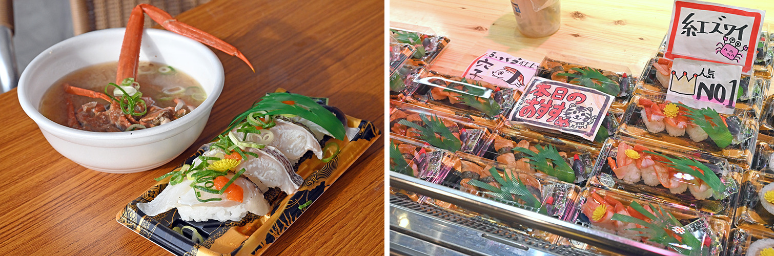 現在は1階の新鮮な魚介類を取り扱う「能登生鮮市場」、こだわりの能登の名産品・伝統工芸品を揃えた「里山里海百貨店 里乃蔵」、新鮮な魚介を味わえる「浜焼きコーナー」などが営業し、2階の「能登グルメ館」では各店こだわりの味覚が味わえるようになっています。