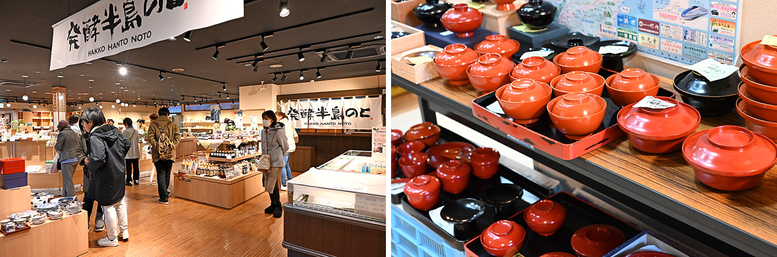 「里山里海百貨店 里乃蔵」には、「発酵半島のと」と題して能登で作られている醤油や魚醤(いしり/いしる)、日本酒などの発酵食品などを揃えたセレクトショップや、和雑貨や器のギャラリーもあり、普段使いできるお手頃な輪島塗の椀や膳などが並ぶコーナーもありました。