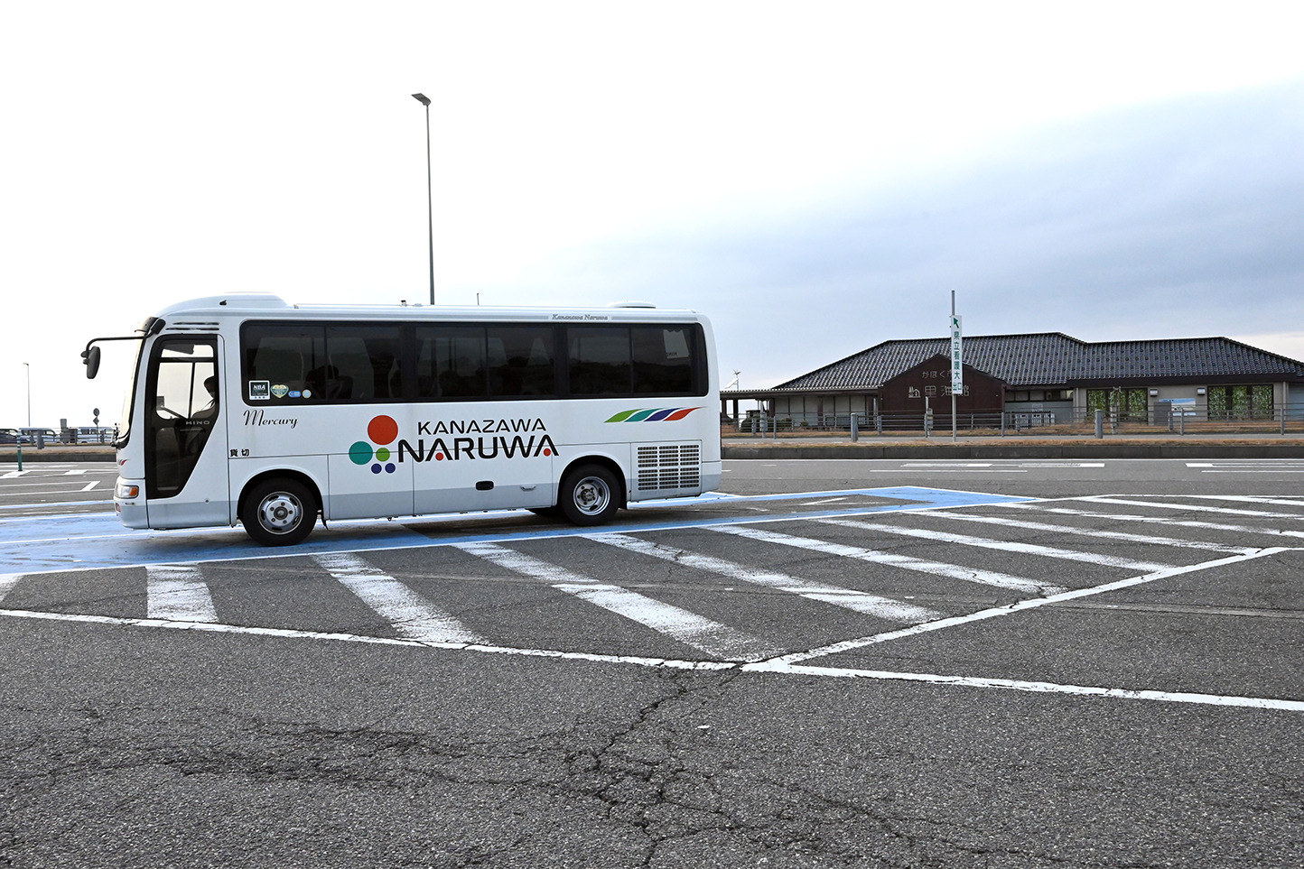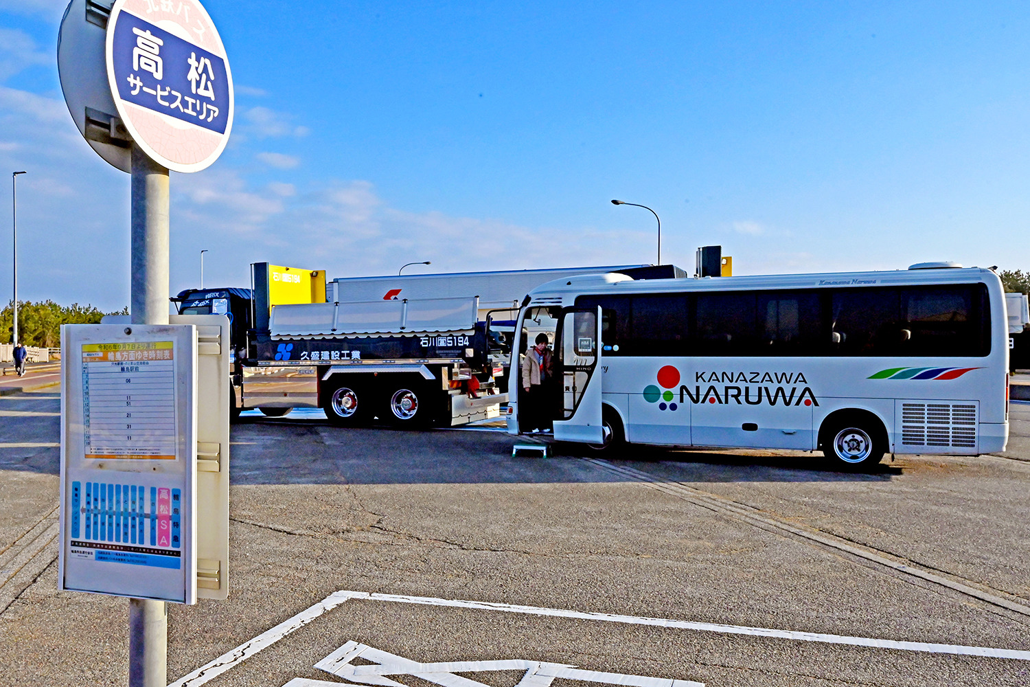 「のと里山空港」を後にして、バスは金沢方面へ向けて走行し1時間20分ほどで「のと里山海道」の高松サービスエリアに到着。往路は下り車線、復路は上り車線側にバスが着くので、高松で乗降する方はご注意を(駐車場から一般道に徒歩で出ることができます)。下車する方はここでお別れ。バスは短い休憩を挟んで再び出発し、「金沢駅西口バス乗降場」「中日本ツアーバス駐車場」の下車地へ向かい解散になります。