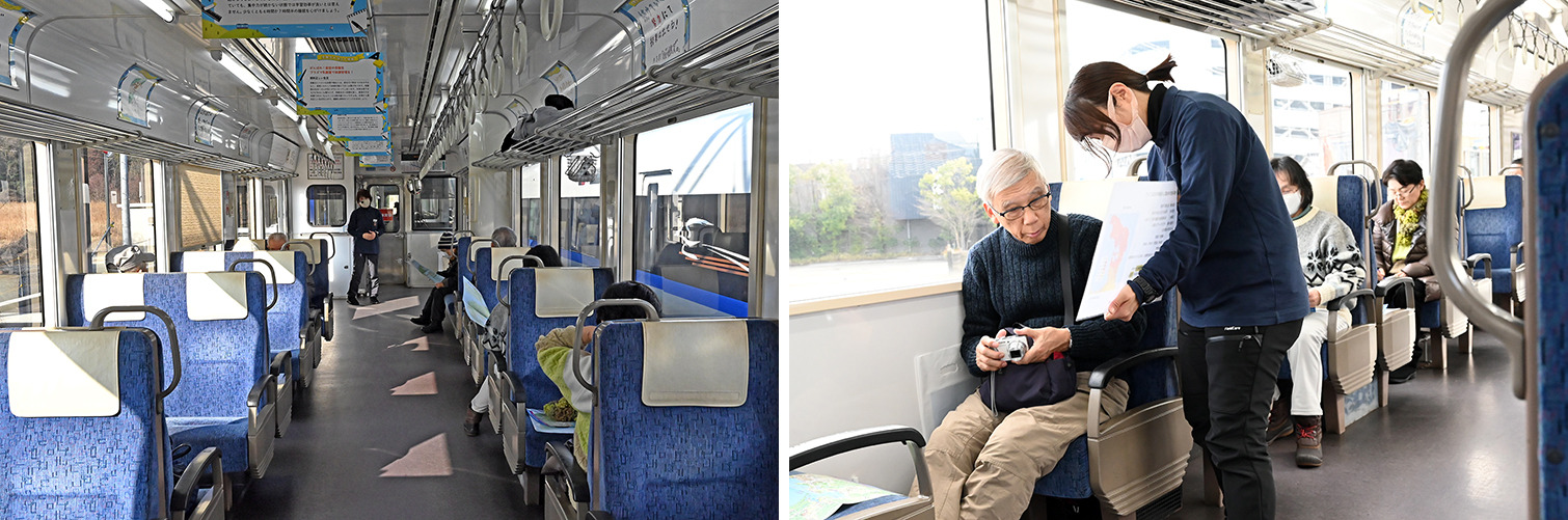 「七尾駅」に到着後、少し休憩時間をはさみ10:04発の「のと鉄道」の「語り部列車」に乗り込みました。「語り部列車」は、「のと鉄道」が2024年9月16日から、地震の風化防止や災害の教訓を伝えるために運行している企画列車です。地震前に走らせていた観光列車の乗務員3名が「語り部」となり、能登に何が起き、人々がいま何を思い、考え、生きているのかを、車窓からの風景とともに“能登の今”として伝えています。この「語り部列車」は旅行会社・団体の予約運行のみで、今回のようなツアー企画でしか乗車できません(4月以降は個人も乗車できる「震災語り部観光列車」を日時限定で運行予定)。