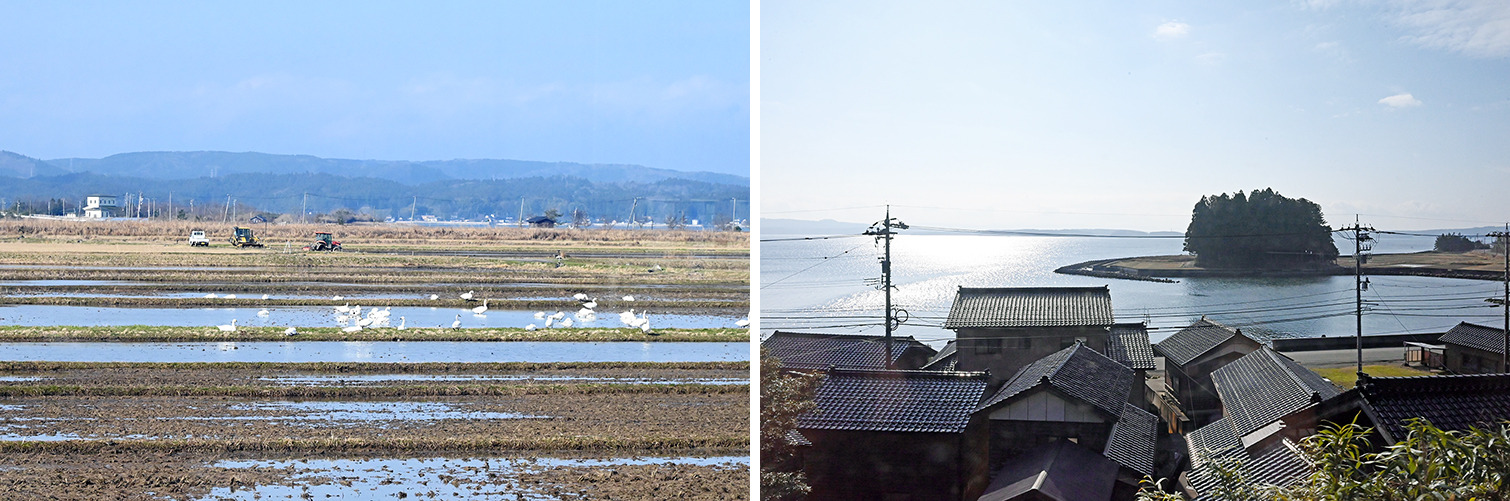 運行中はちょうど飛来していた白鳥の群れ、運がよければイルカの姿が見られる海岸、桜の名所の能登鹿島駅、鹿島神社やボラ待ちやぐらなど、沿線のビュースポットや震災の影響などが通過に合わせて紹介されました。