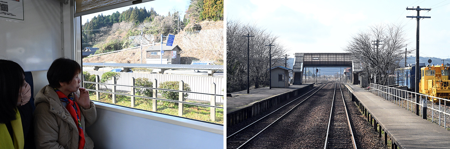 - 地震の恐ろしさは、月日が経っても薄れることなく、今も深く胸に刻み込まれています。1年間で地震、水害と辛いことや悲しいことをたくさん経験しましたが、お客さまとの交流が励みになっています。「語り部列車」では私たちの体験談はもちろん、各地での被災状況や復興への歩みも丁寧にお伝えし、震災後も変わらない能登の自然や魅力もあらためて感じていただければ嬉しいです。