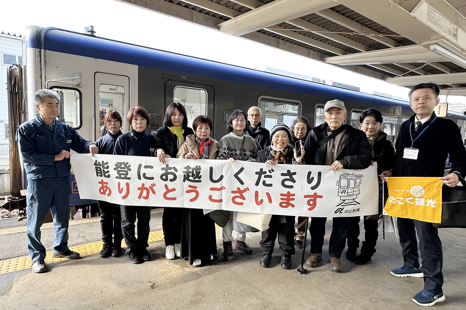 2024年秋に開催されて好評だった「今行ける能登」応援ツアーの第2弾として、2025年1〜3月に4コース・計17回のツアーが企画されました。この「語り部列車コ―ス」は、貸切バスと列車を利用して七尾市・輪島市を訪れ、「のと鉄道」語り部列車や輪島の朝市通り、能登空港で震災体験を聞いて能登の今を知り、出張朝市や道の駅などでのお買い物で消費による応援を目指す内容になっています。