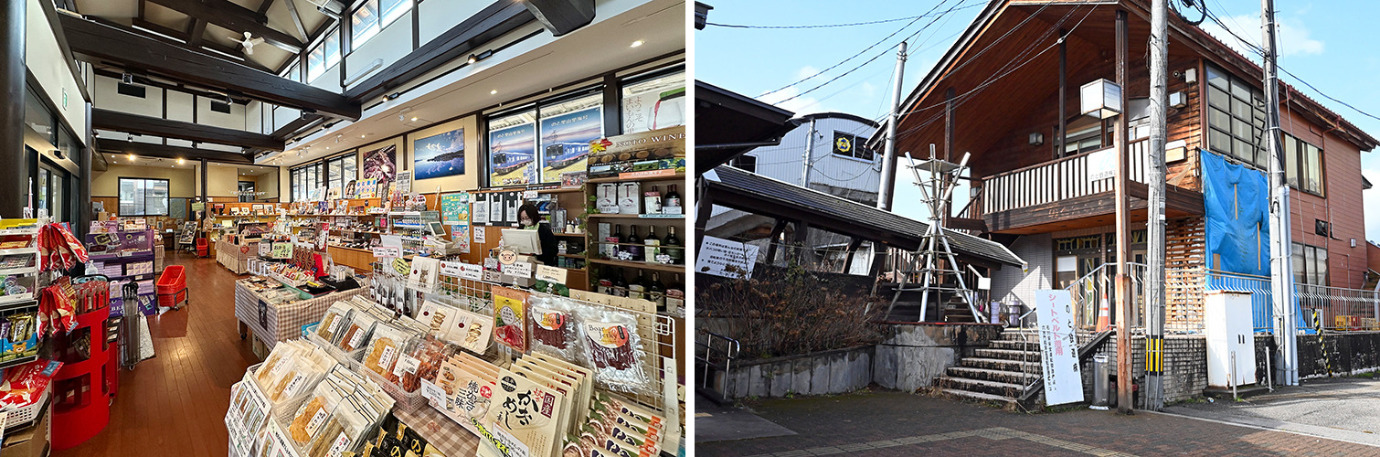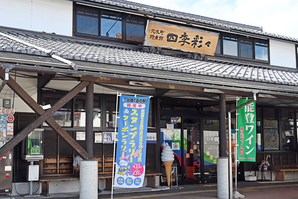 語り部の皆さんとお別れし、駅に隣接する穴水町物産館「四季彩々」の前で貸切バスが待機していました。バスの出発までわずかな時間でしたが、「四季彩々」で飲み物などを買うことができました。