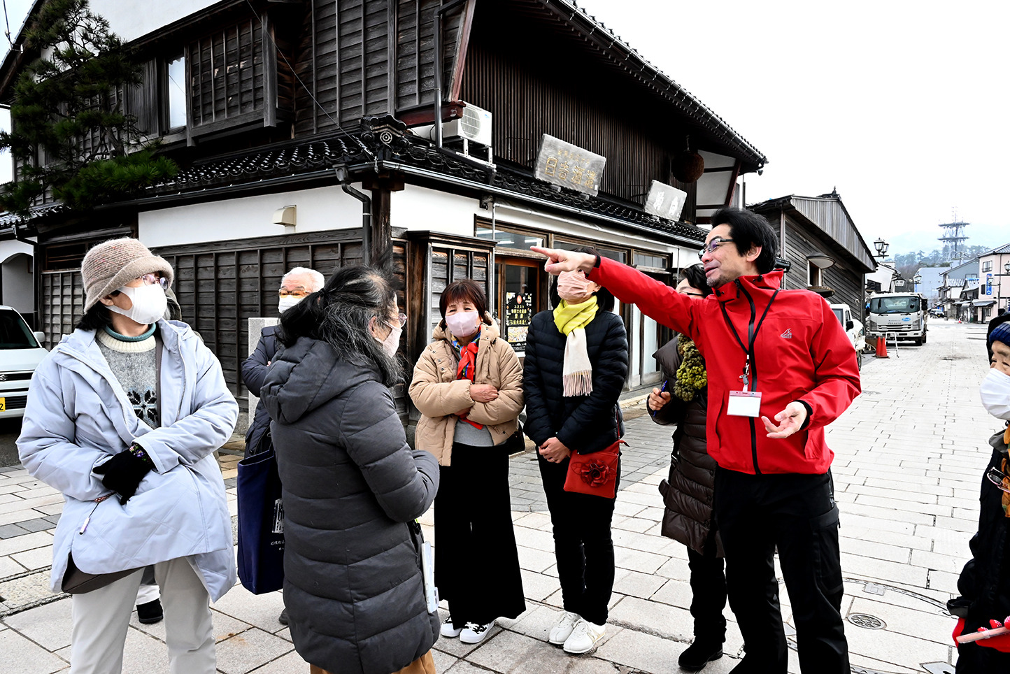 輪島市の中心部、河井町の朝市通りに到着すると、輪島市朝市組合の組合長・冨水長毅(とみずながたけ)さんが町を案内してくれました。
