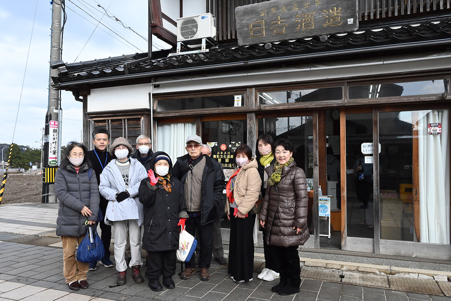 最後に火災を免れた「日吉酒造」の前で記念写真。店舗ではお酒の販売をされていましたが、蔵は被災してお酒が造れないため、他地域にある酒蔵の協力で酒造りを行っているそうです。