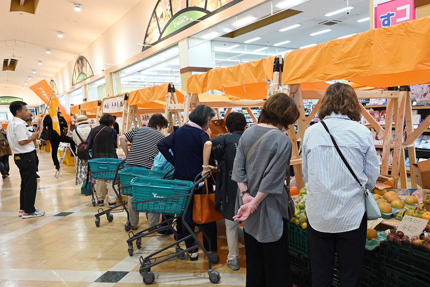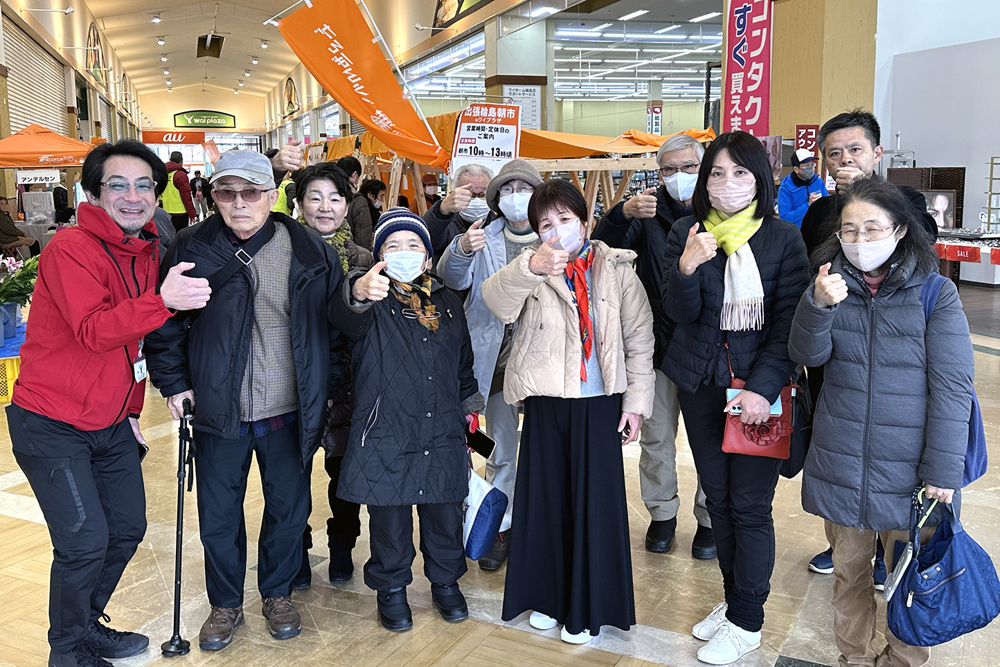 貸切バスで10分ほど市内を移動し、輪島市の商業施設「パワーシティ 輪島ワイプラザ」に到着。グルメ館、ホームセンター、ファッションプラザなどが入った大型店舗で、店内の広い通路が「出張 輪島朝市」の会場になっています。