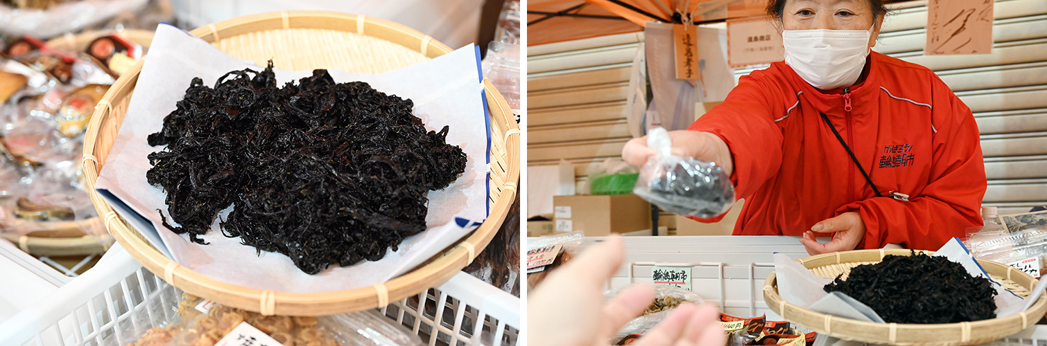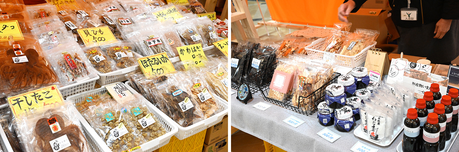 ずらりと並んだオレンジ色のテントには、野菜、輪島塗などの工芸品、鮮魚や干物、海産物の加工品などが並び、かつての活気に満ちた輪島朝市の姿が重なります。魚介や海藻を加工した珍味や、甘辛く煮付けた貝類などは試食もできました。
