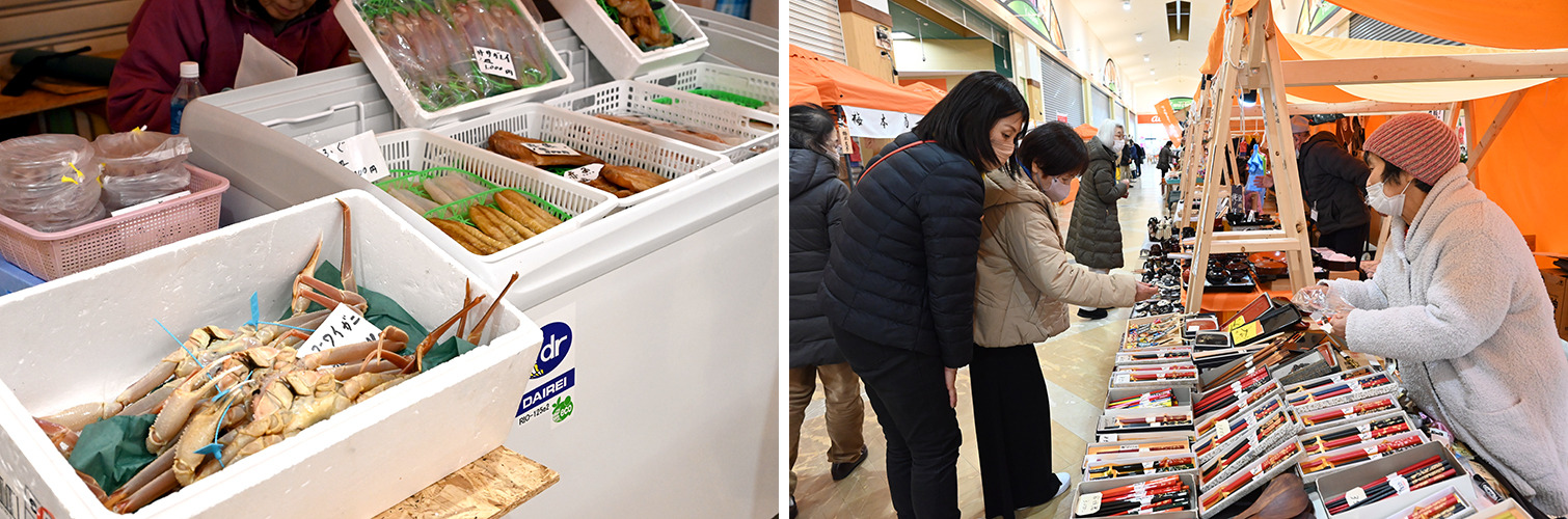 - 昨年はようやく輪島で朝市が再開できると喜んでいた矢先の豪雨水害で、朝市の組合員の中には大きな被害にあった者もいましたが、皆んなで前を向いて頑張っています。能登の美味しいもの、いいものを用意して待っています。ぜひ、おばちゃん達の顔を見に来てください。