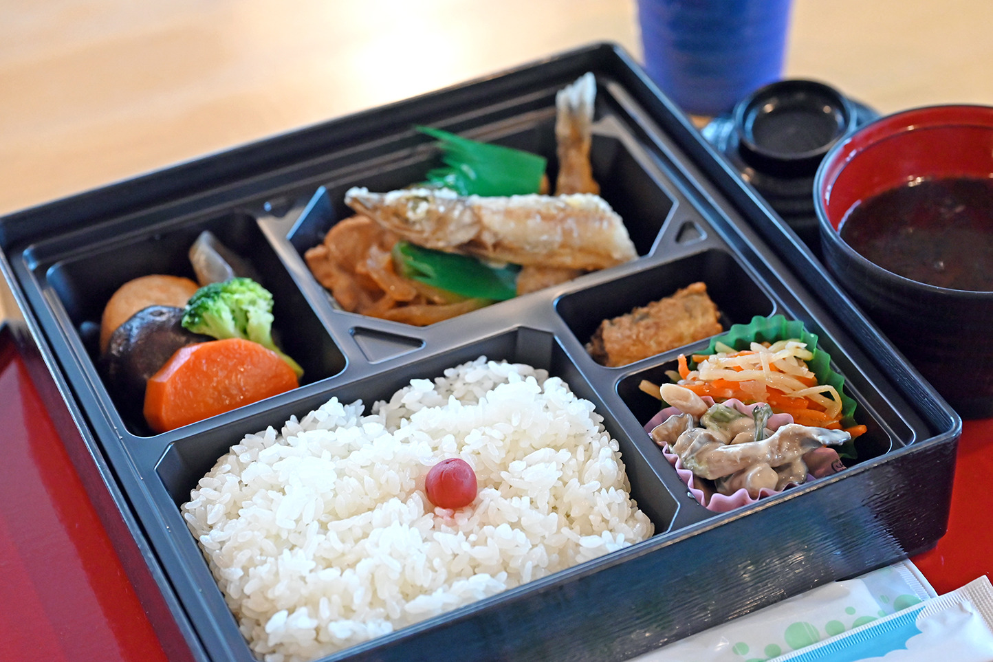 松花堂弁当はメギスの天ぷらや豚の生姜焼き、煮物などおかずも盛りだくさんで、イワシのコンカ漬け(糠漬け)や海苔のお味噌汁は能登ならではの味わいでした。