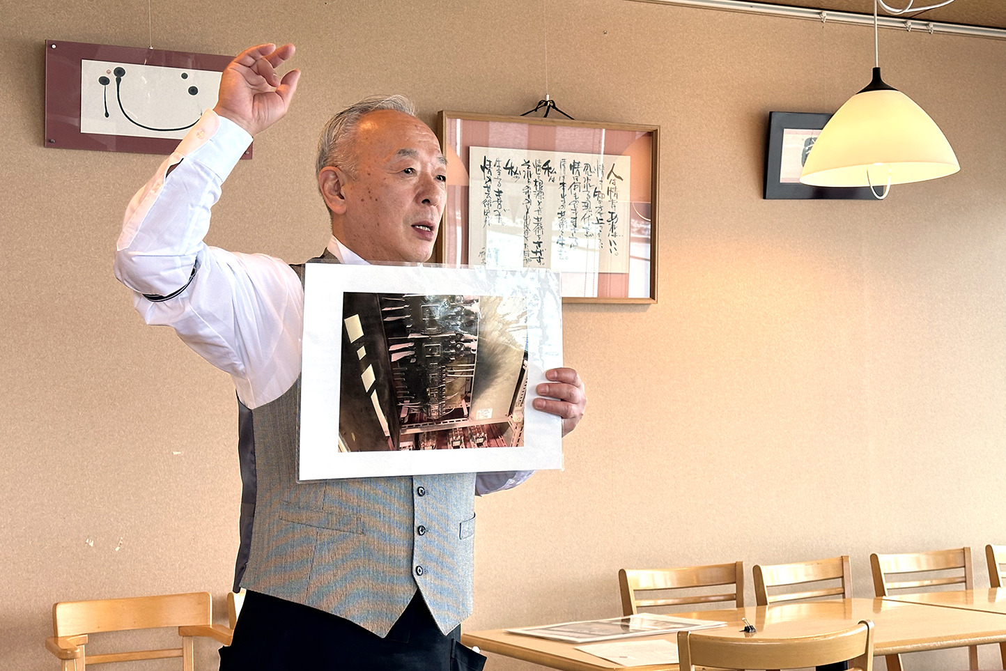 この日の語り部さんは、地震発生時に観光列車に乗務していた宮下左文さんと坂本藍さんの2名。ベテラン乗務員の宮下さんがメインの語りを担当し、坂本さんが写真パネルを持って座席を回り、沿線の観光情報、震災・豪雨災害と今の能登のことを紹介してくれました。