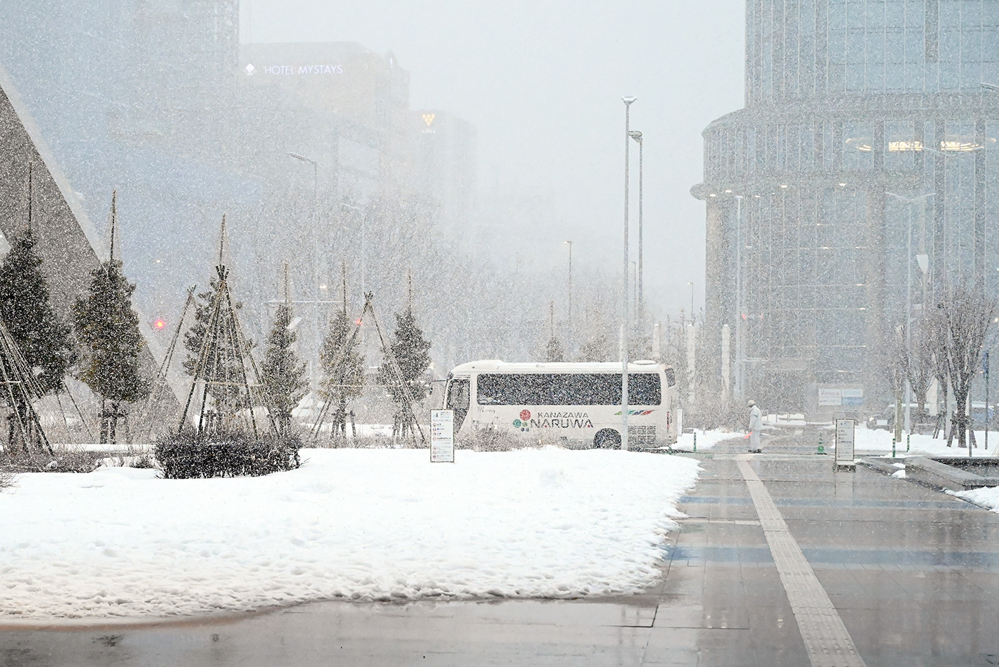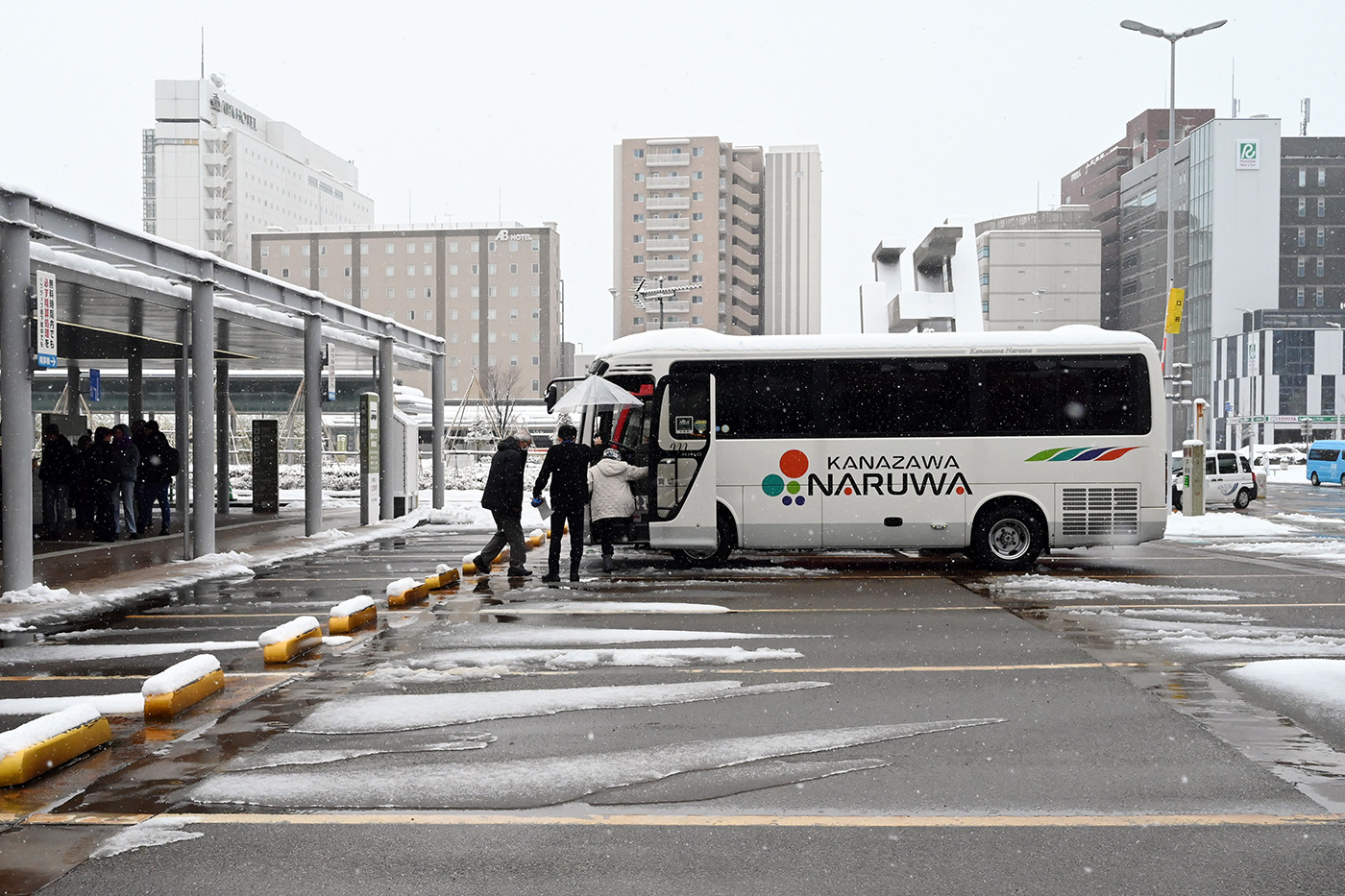 今回は「外浦コース」は「金沢駅」の西口(金沢港口)にある「金沢駅西広場団体バス乗降場」から乗車しました。集合場所では「ほっこく観光」添乗員の松原さんと、「中日本ツアーバス」のバス運転士の村中さんが迎えてくれました。