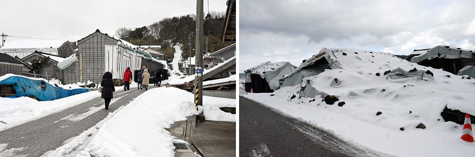 しかし、またしても2024年元日の能登半島地震で約4割の建物が半壊以上の被害を受けてしまったそう。まだ手付かずのままの倒壊した建物、ブルーシートがかかった痛々しい姿が見られました。
