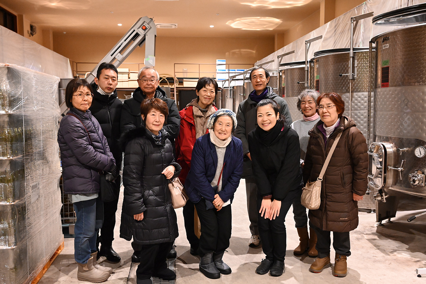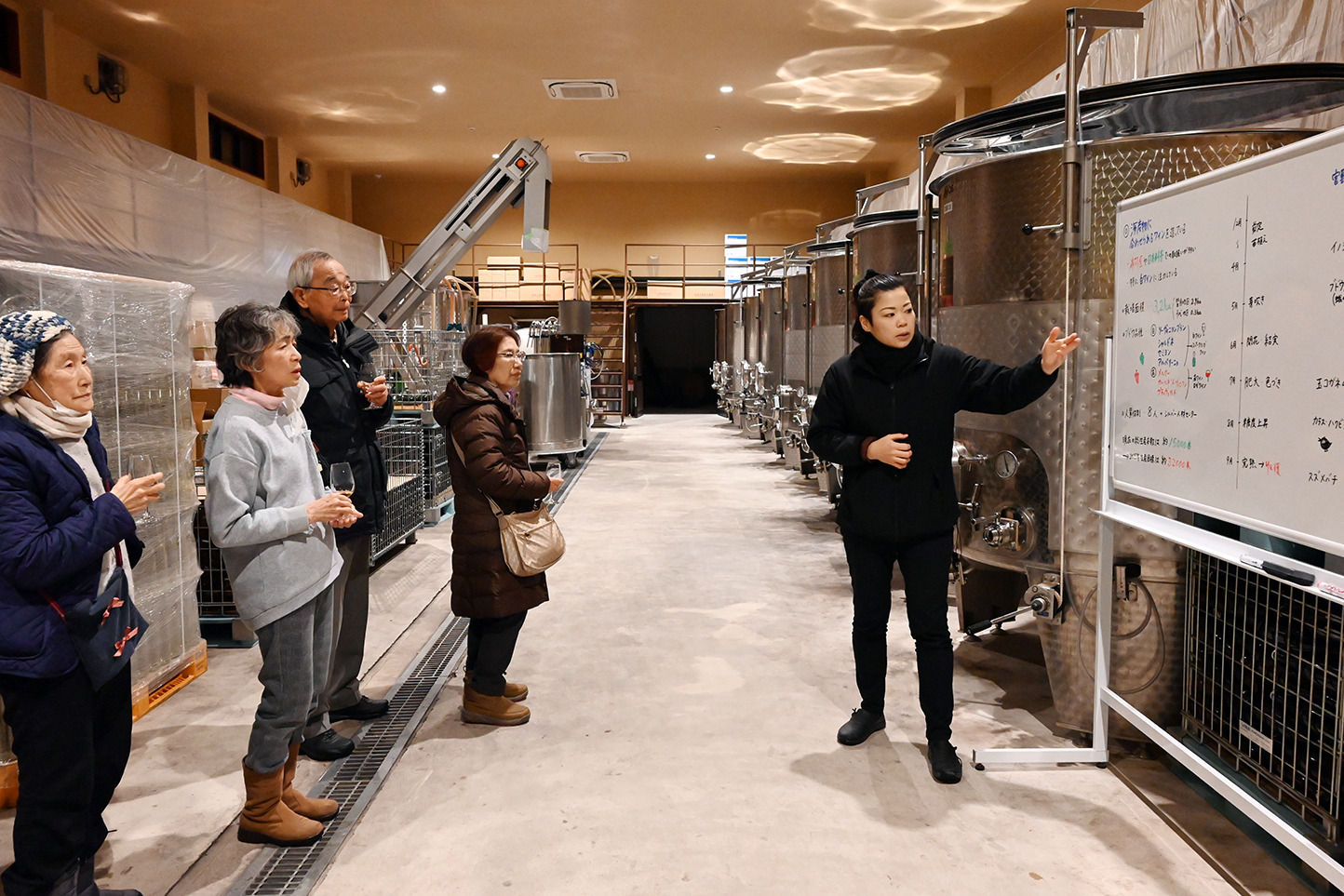 ワインを仕込むステンレス製の大きなタンクが並ぶ前で、2012年から畑を開墾し「この土地でしかできないワイン」づくりを行なっていること、ワインの製造工程やブドウ品種のこと、2024年元日の地震と9月の豪雨による被害などについてお話を聞きました。