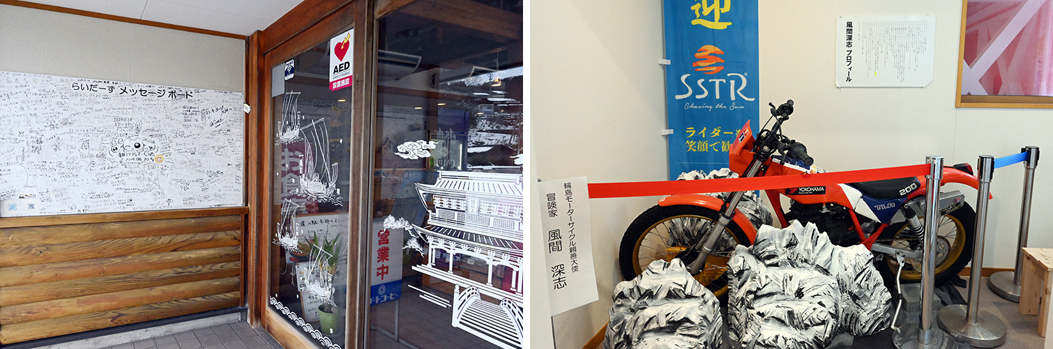 店の入口にあったメッセージボードが目に入り、お店の方に聞いてみると、輪島市は全国初となる「ライダーを笑顔で歓迎する都市」を宣言し、能登路の玄関口となる道の駅 赤神ではライダー専用駐車場や交流の場としてメッセージボードを設置しているそう。「店内には世界的冒険家でSSTR(サンライズ・サンセット・ツーリングラリー)プロデューサーの風間深志さんが、エベレスト登坂で使用したバイクも展示していますよ」と教えてくれました。「赤神」の地名の由来になった日本海に沈む夕日が美しいそうなので、次はその絶景も見てみたいと思いました。