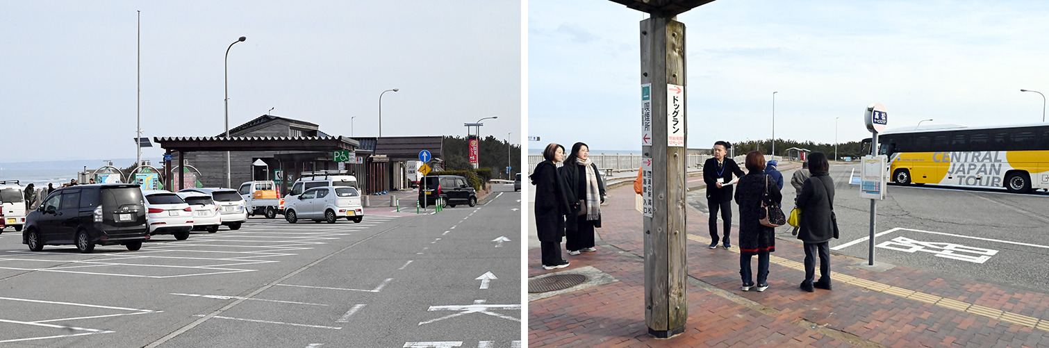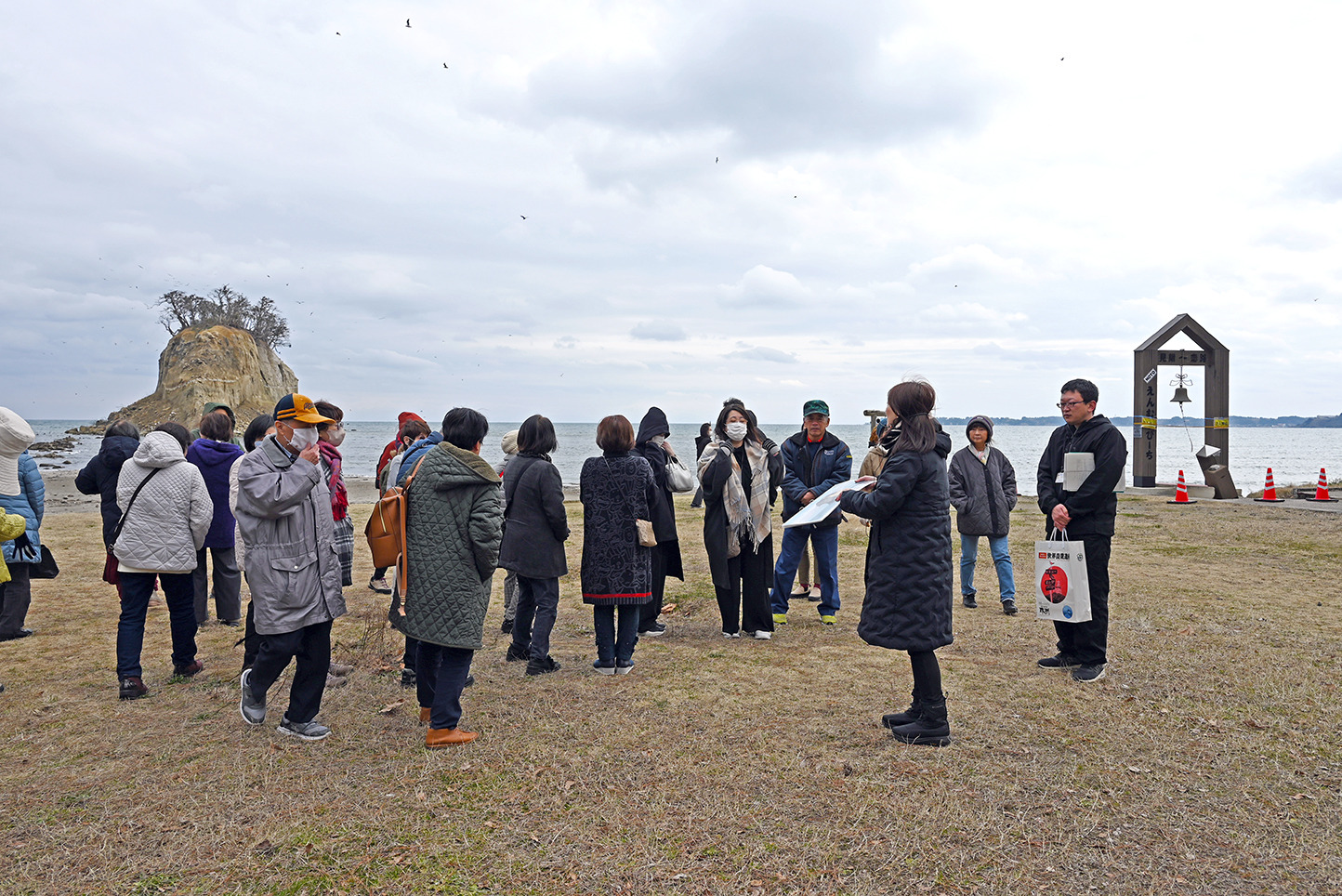 最初の訪問地である珠洲市の鉢ヶ崎海岸に到着すると、「奥能登国際芸術祭実行委員会」の水上昌子さんが「奥能登国際芸術祭」のことや、能登半島地震の被災状況について説明してくれました。奥能登国際芸術祭の作品鑑賞のツアーが行われたのは、震災後この日が初めてとのこと!