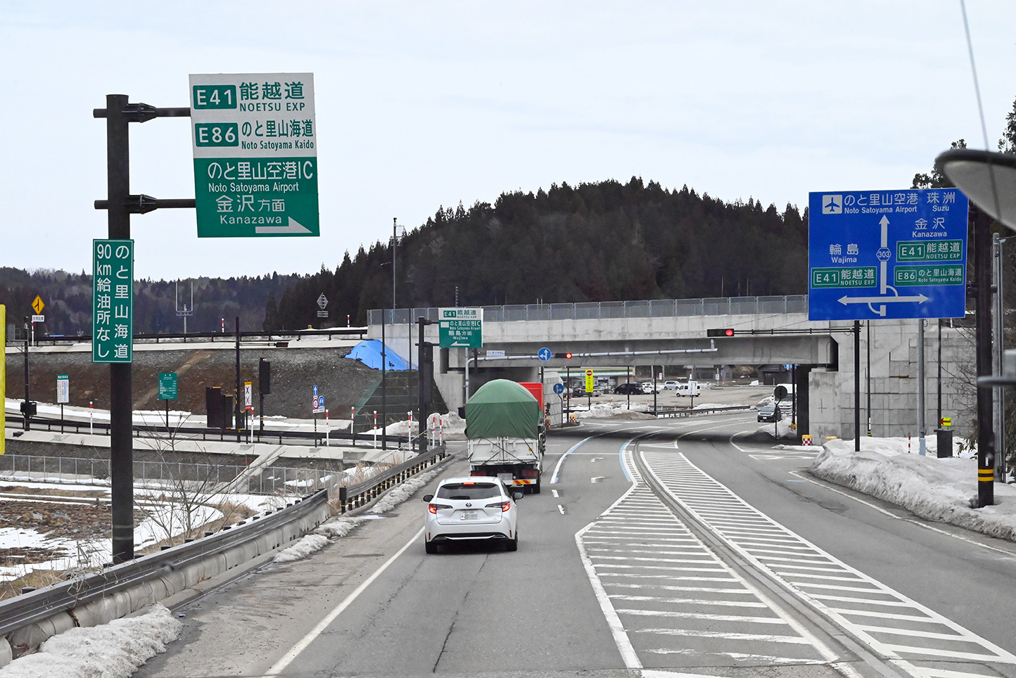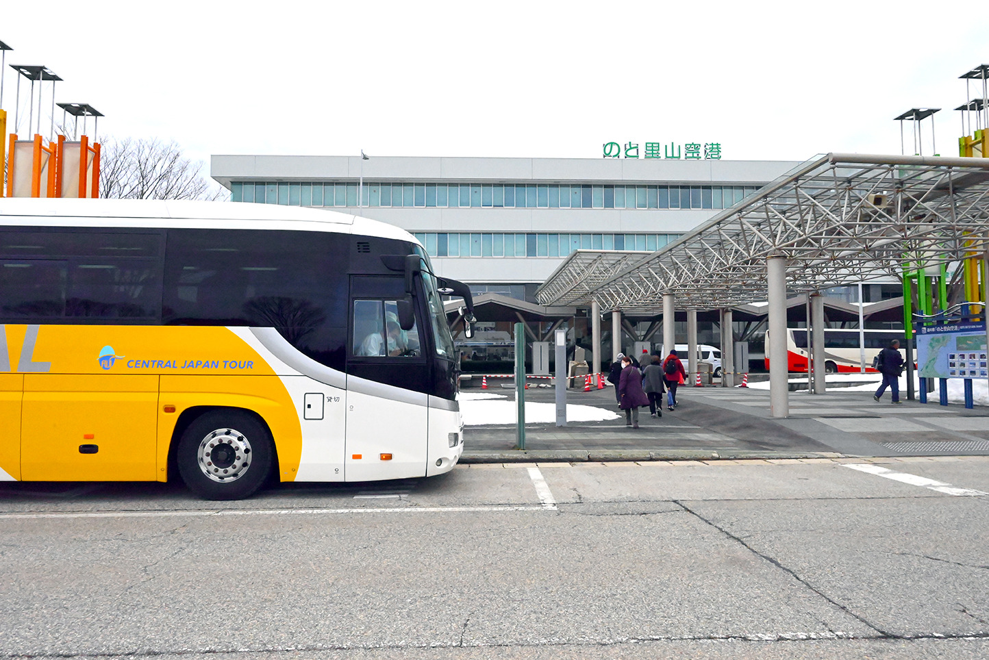 穴水町から珠洲方面への道に入り、「のと里山空港IC」の出入口を通過。大型車でなければ、のと里山海道でここまで来ることもできると説明があり、ICから5分少々で能登の空の玄関口「のと里山空港(能登空港)」に到着しました。
