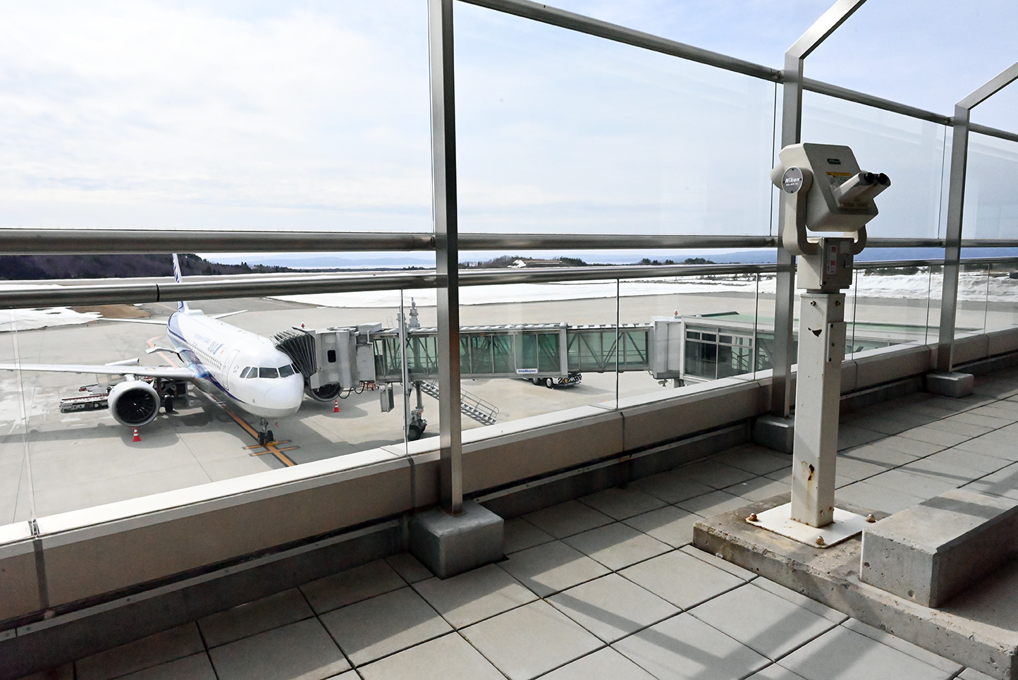 3階の展望デッキへ行くと、到着したばかりの午前便を見ることができました。のと里山空港は、地震の発生直後は滑走路に亀裂や段差が生じて飛行機が離発着できない状態でしたが、応急的な復旧工事が終わると自衛隊の輸送機の発着に利用され、ANA(全日空)の能登-羽田便の運行が臨時便、定期便と段階的に回復し、昨年の12月下旬から震災前と同じ1日2往復で運行が復活しています。