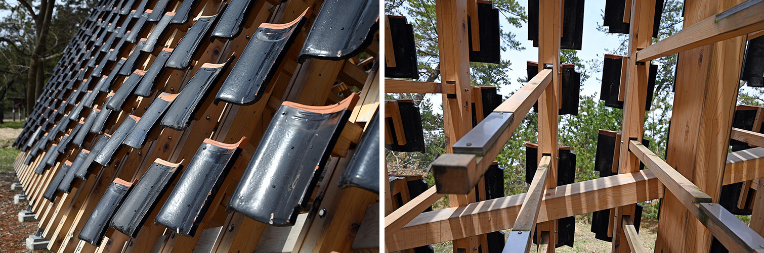 珠洲は珪藻土を使った能登瓦の産地でしたが、今では生産者が途絶えていること、地震で家屋の屋根瓦の多くが割れてしまったことなどを考えると、作家が「家というものを記憶を集めるエネルギーの象徴」ととらえ、「集まることは力になる」をコンセプトに、昔の記憶を掘り起こしていくことをテーマにしたというのが、震災を経てより意味深いものに感じられました。