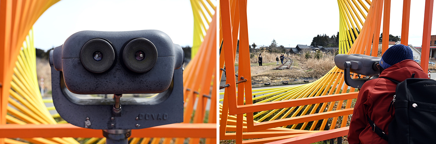 「のと鉄道」能登線が2005年に廃線になり、蛸島駅も廃駅となりました。作家は「終着点を地域の再生と未来を望むような場所に」という思いで作品を構想したそう。道路で断ち切られた線路跡に、駅に向かってカラフルな渦巻くフレームが設置され、その中にある双眼鏡を覗くと、線路の終点の横に「Something Else is Possible」という作家からのメッセージが見えます。「なにか他にできる」というメッセージも、復興に向けて大切な想いを投げかけているように思えました。