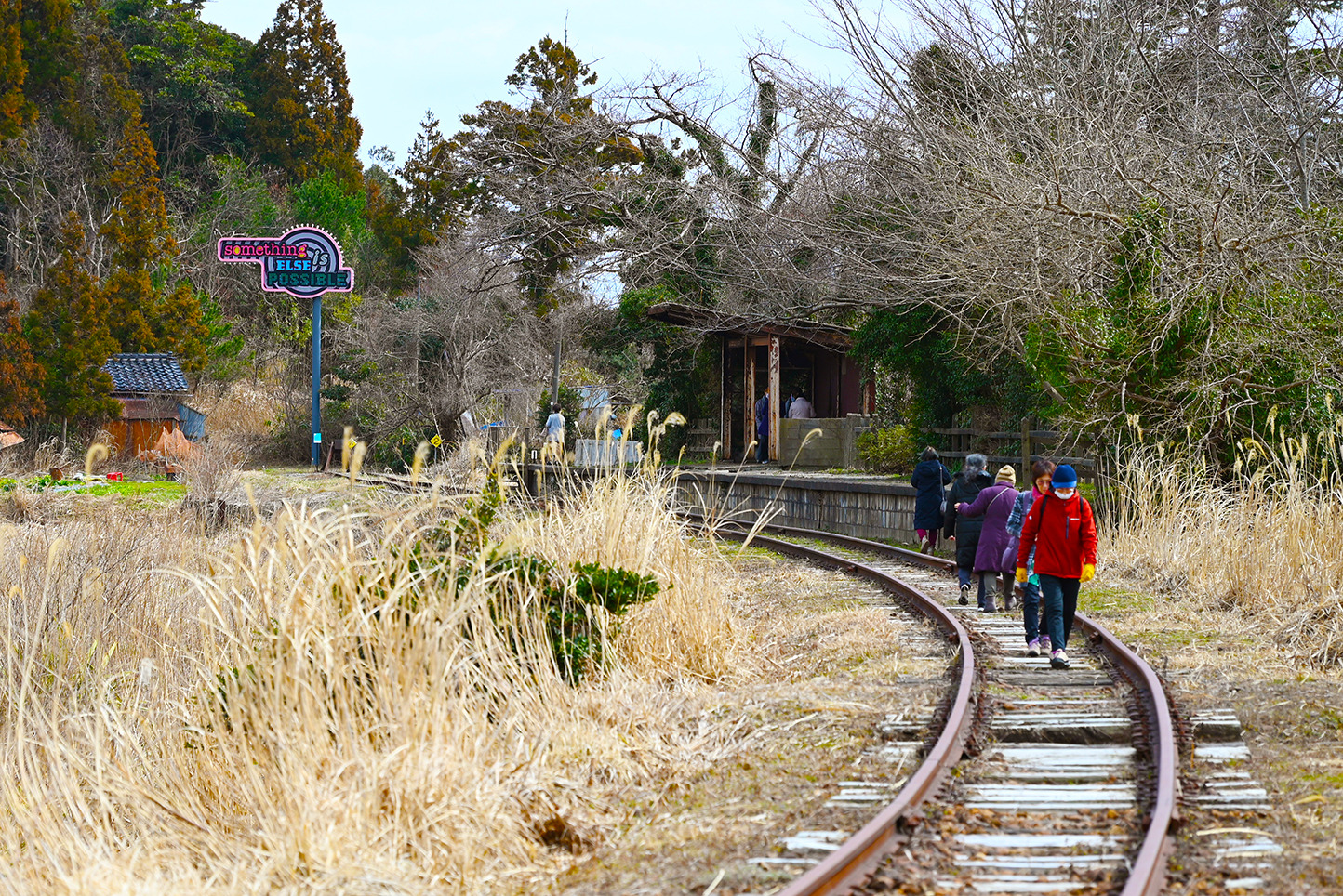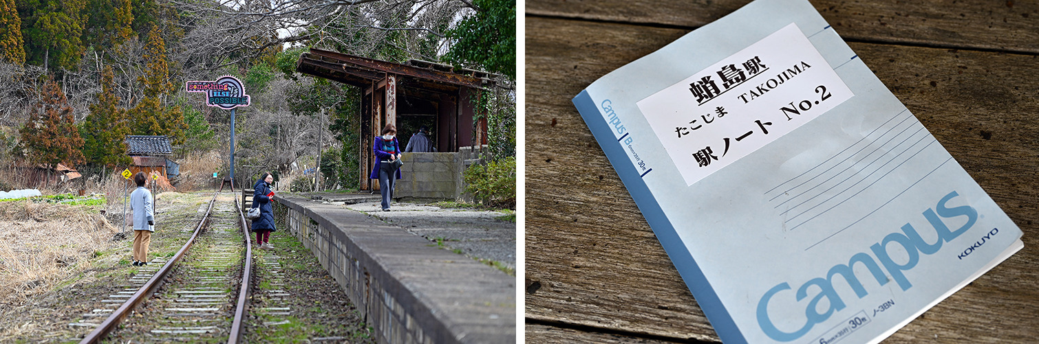 線路を歩いて終点まで行くのもアートな体験です。駅のホームには1冊のノートがあり、訪れた人が書き込んだメッセージを読むことができました。2024年の元日に書き込まれたものや、災害ボランティアで訪れた方のメッセージもありました。応援ツアーで訪れた記念にメッセージを残していくのもいいですね。