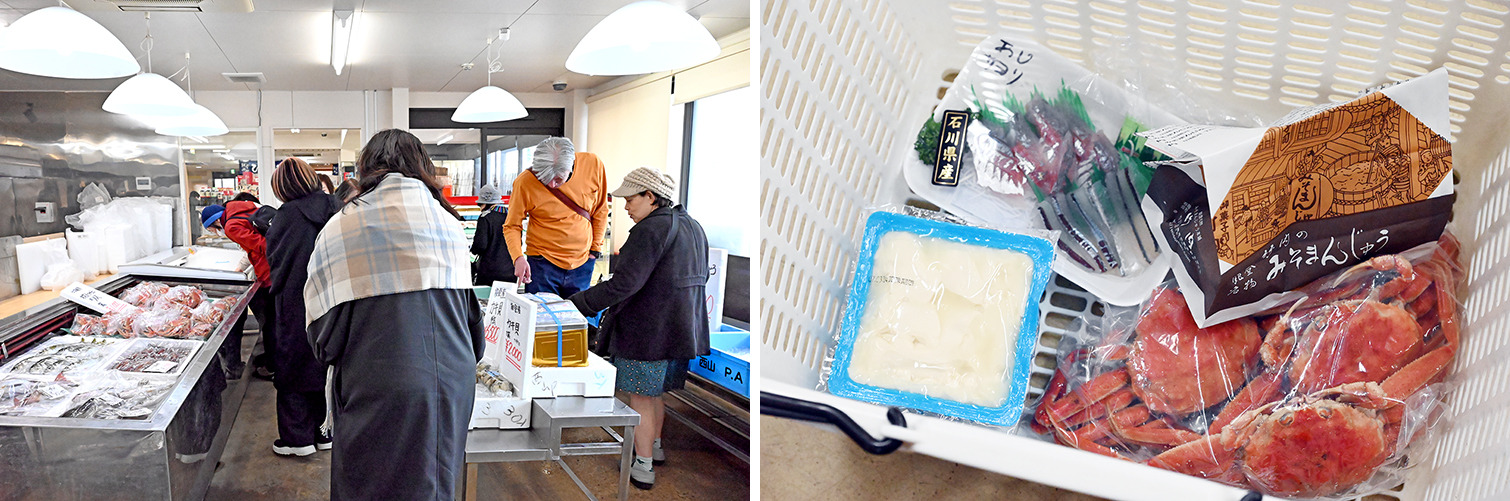 西山PAでは志賀町の特産品や食品を中心に、近隣の市町のお土産品が購入できます。店内にある鮮魚店も人気で、夕食用にお刺身や惣菜を購入している参加者の方も。最後の休憩とお買い物を終えて、再び帰路につきました。