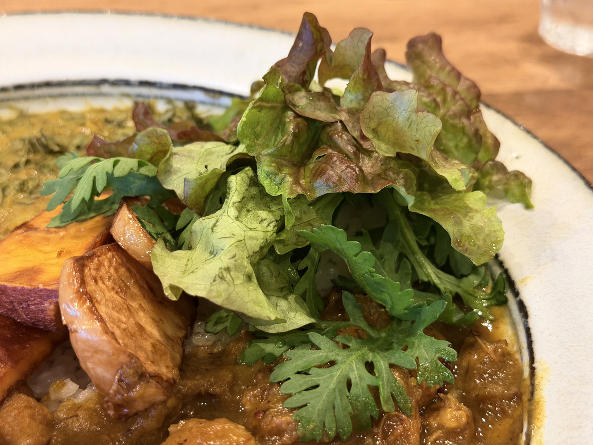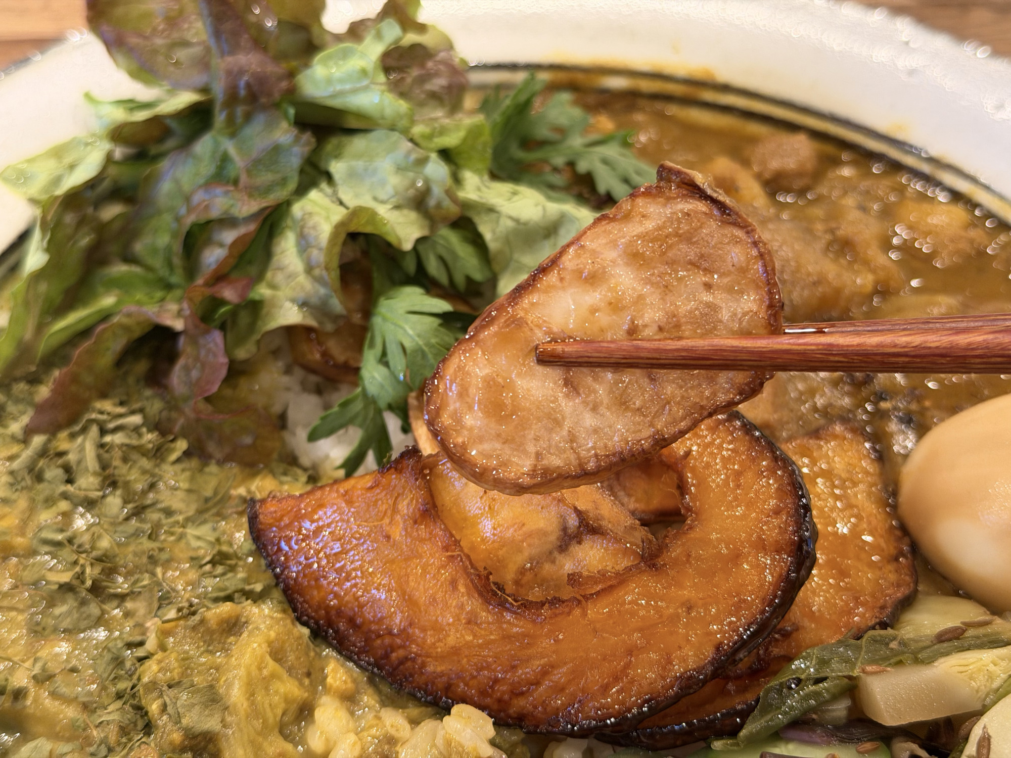 朝採れの野菜をふんだんに使ったカレーは、ふわっとやさしくスパイスが香る、甘めの味付けが特徴。