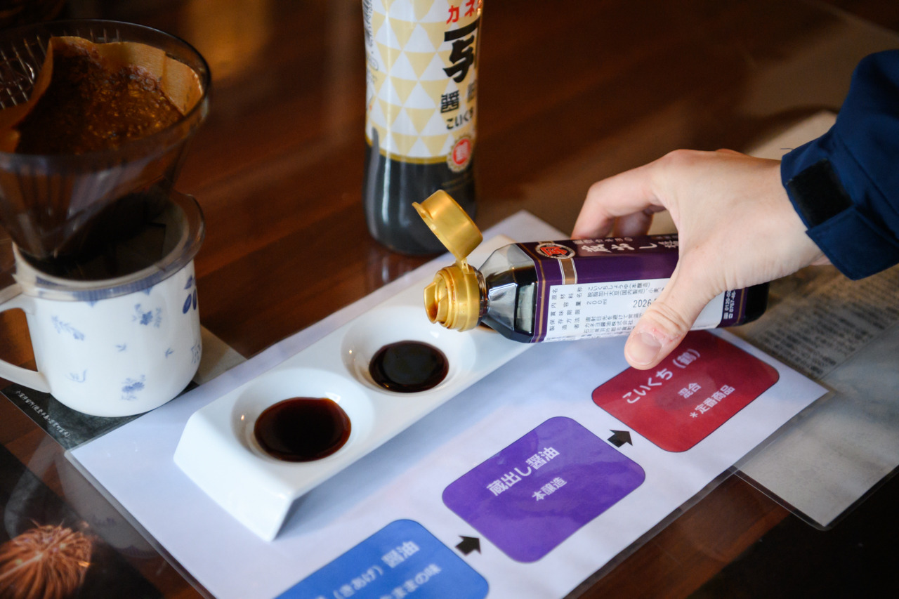 見学の最後には、醤油の食べ比べを体験できます。蔵でもろみを絞って生まれる希少な「生揚げ醤油」は、ここでしか味わえない特別な一品です。