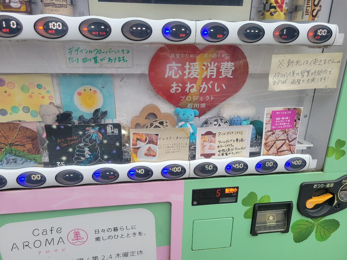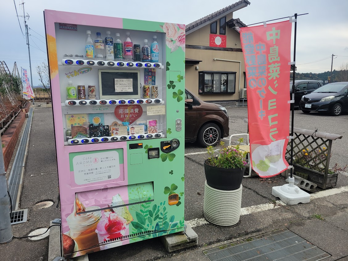 お店の前には、お店のロゴカラーに塗装された可愛い自販機「ボードステーション」が設置されています。中島菜ショコラやドリンクを営業時間外でも購入でき、食以外の楽しみも広がる能登中島町の小さなオアシスです。