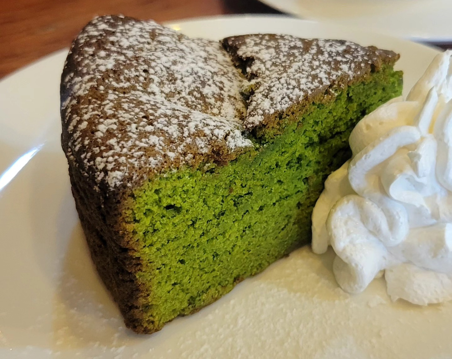 濃厚な緑色は中島菜そのものの色! オーナーが g 単位で配合を試行錯誤して作り上げたという中島菜ショコラは、ほろ苦さとショコラの濃厚さが調和した一品で、甘いものが少し苦手な方にもおすすめできます。